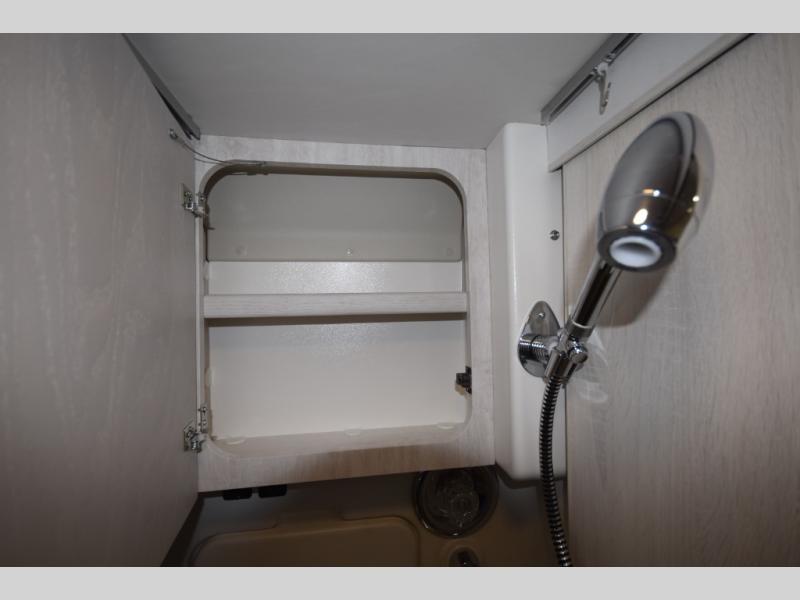 Freshen up in the rear wet bath featuring a fold-down lavatory sink, wardrobe storage for towels and clothing, and sliding doors that create a private, enclosed space.