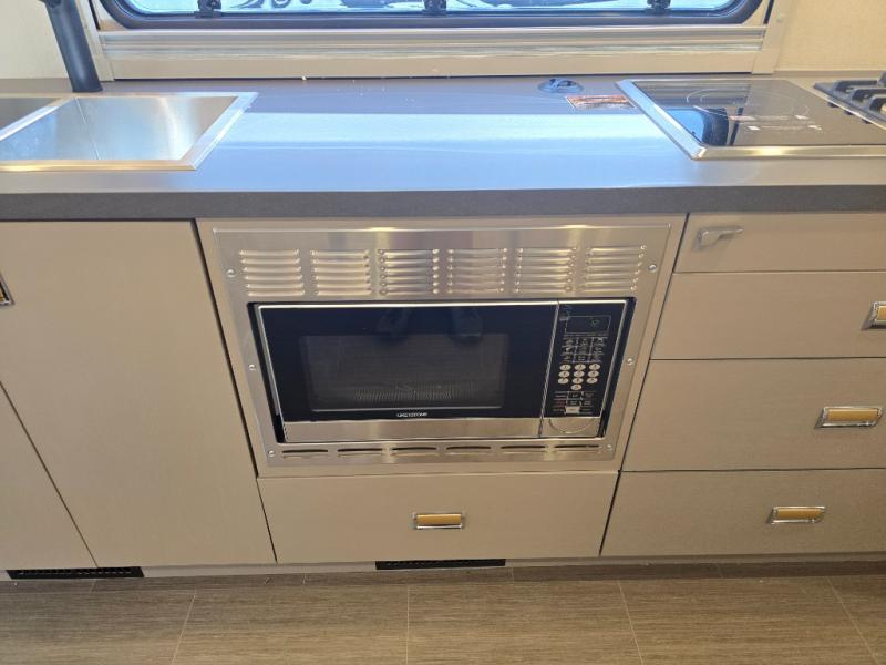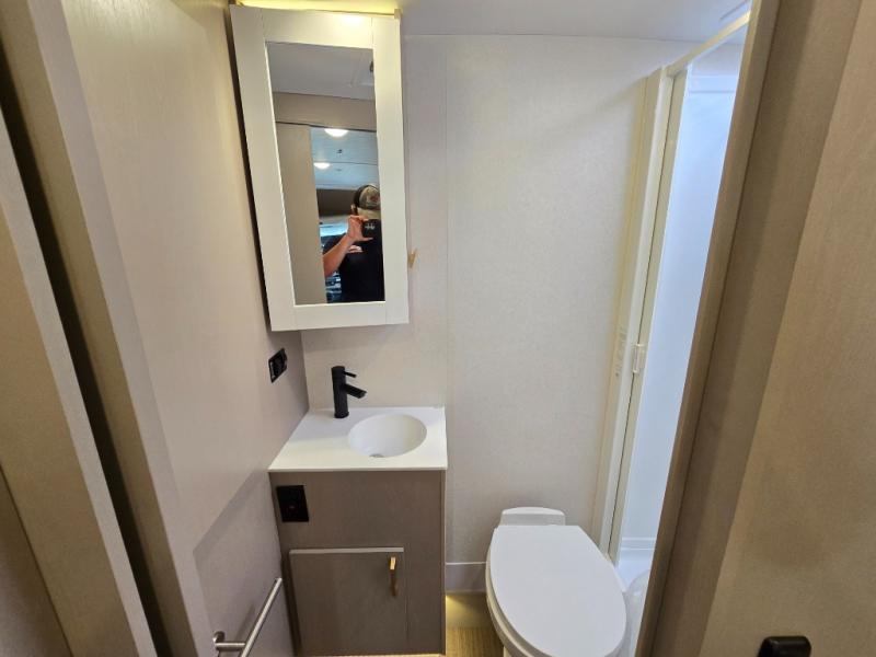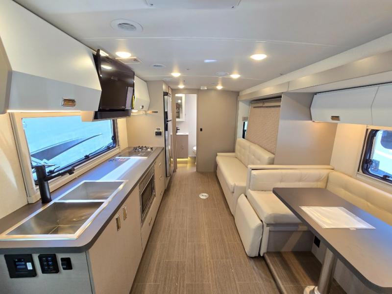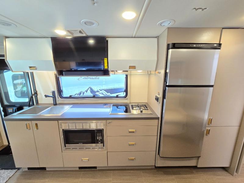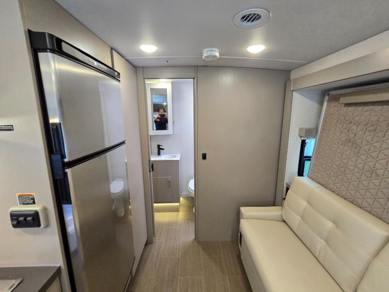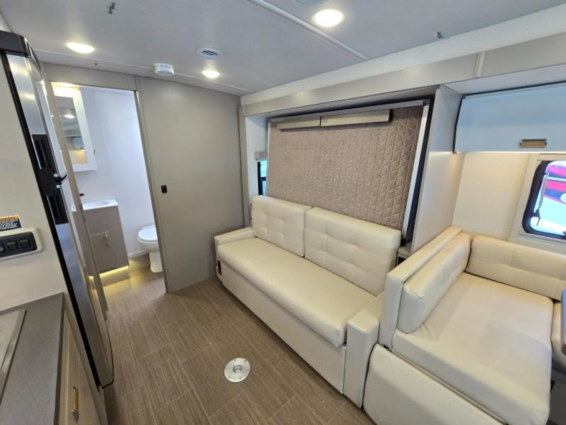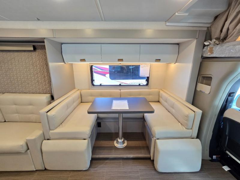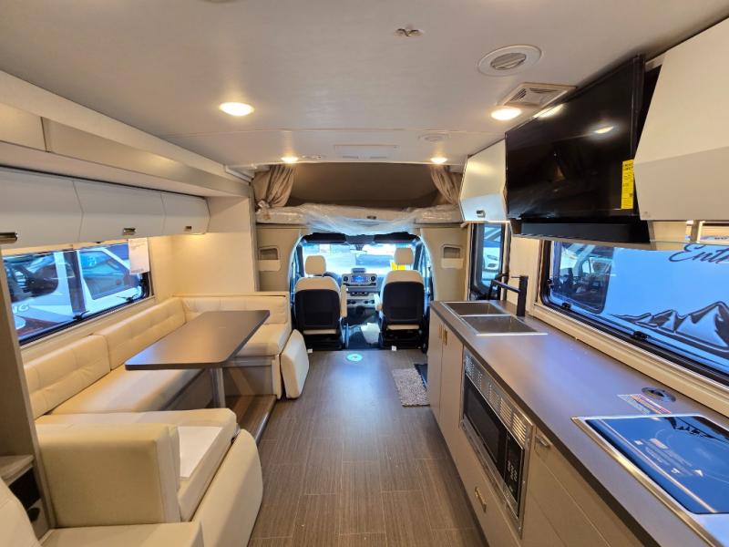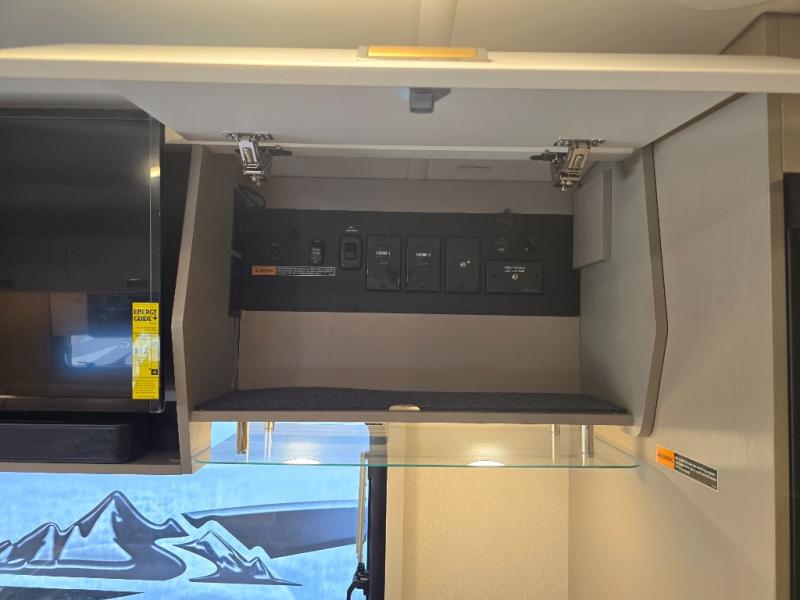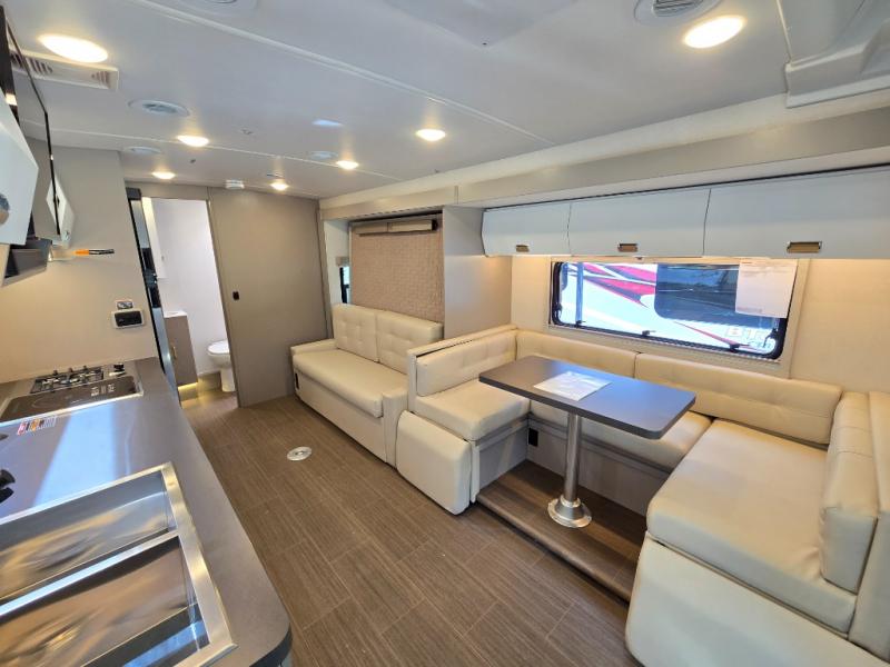 A couple or family will enjoy the look of the interior each time they take this View Class C diesel motorhome on the road. You will be able to easily set up the queen Murphy+ bed when it's time for bedtime while the kids sleep on the bunk above the cab or the U-shaped dinette. You might like to add the theater seating option with swivel tables if you don't need that extra sleeping space. Everyone can get cleaned up in the full rear bathroom that has a space-saving sliding door before making meals with full kitchen amenities including a convection microwave/oven.