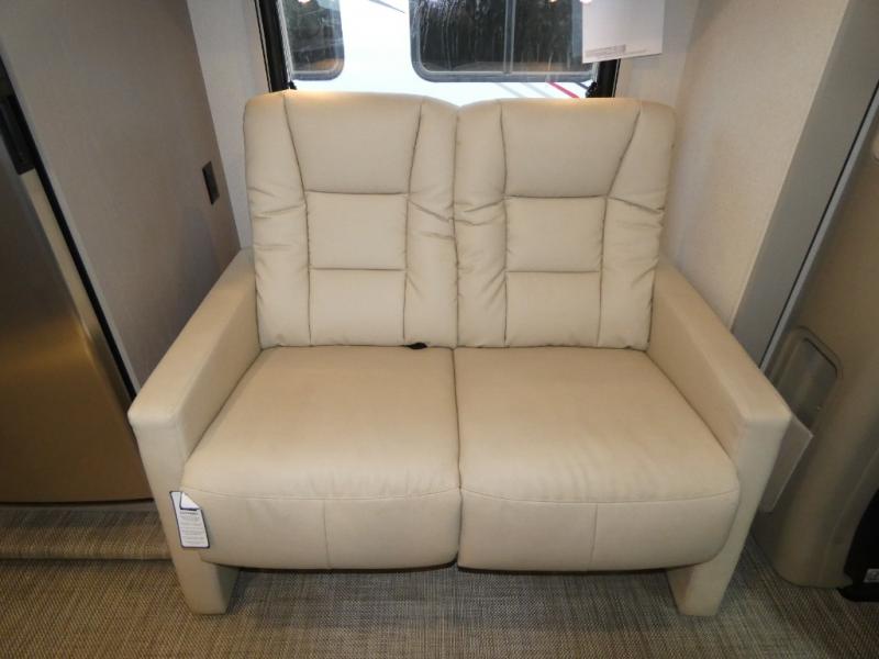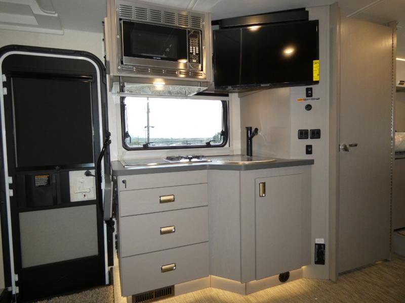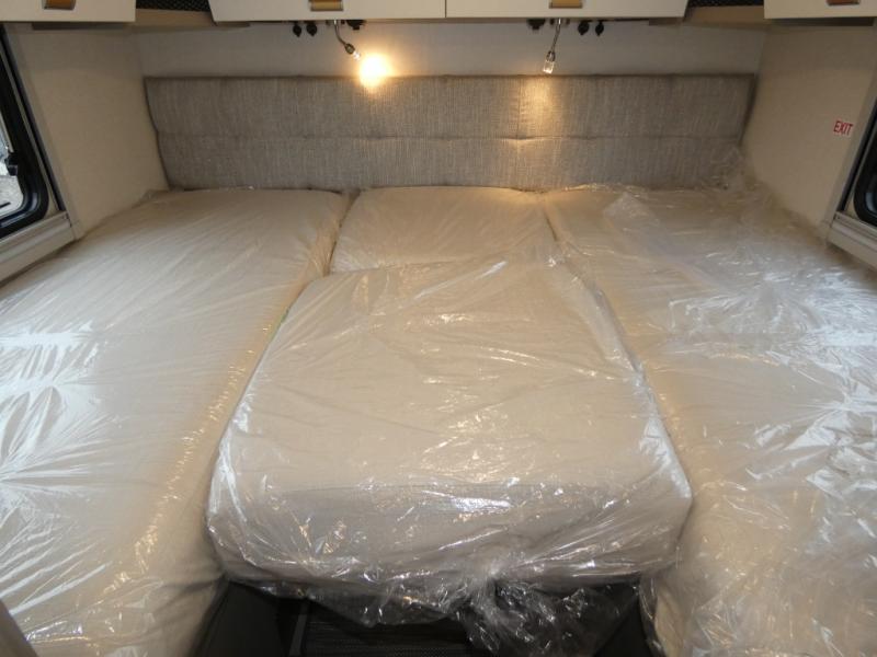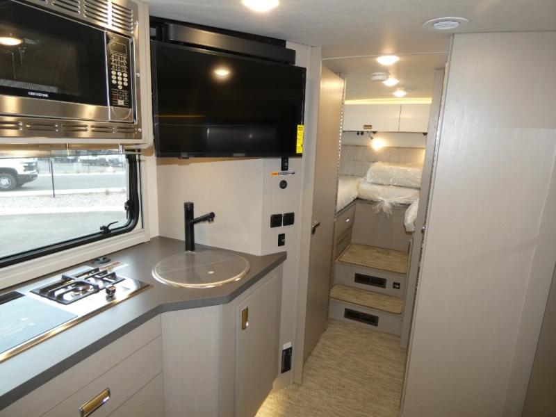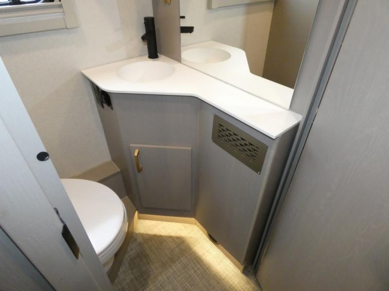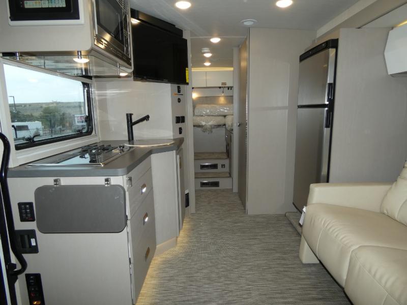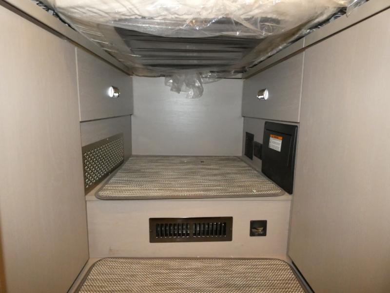 This is the perfect coach to travel with your honey or hiking buddy since there are two 32" x 76" twin beds in the back that can convert to a king-size bed if you choose! And the TrueComfort+ sofa with a movable pedestal table plus the cabover bunk will provide additional sleeping space. You can choose the optional low profile front cap with storage if you do not need the added sleeping space. There is a 25" x 30" shower across the hall from a private toilet and sink so two people can freshen up at once. You will also be able to create meals each day since there is a two-burner cooktop and convection microwave, and the 12V refrigerator will keep cold items fresh!