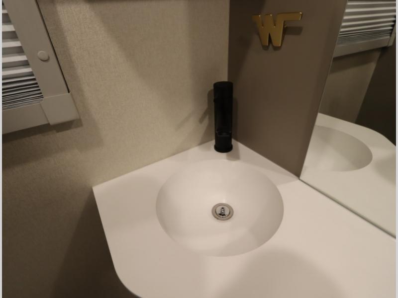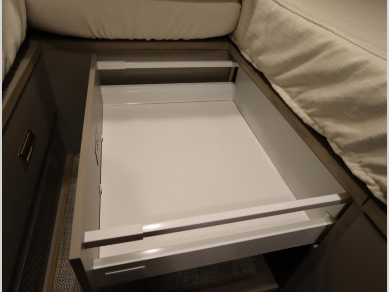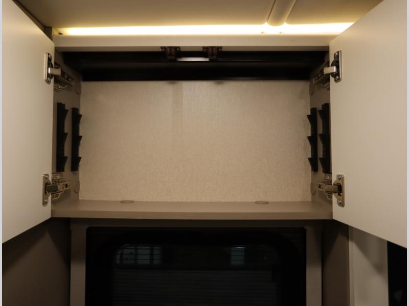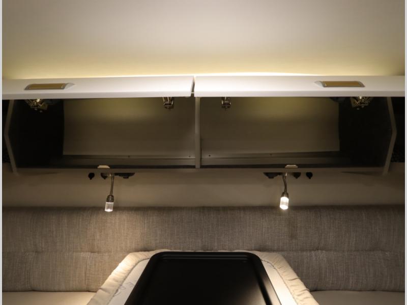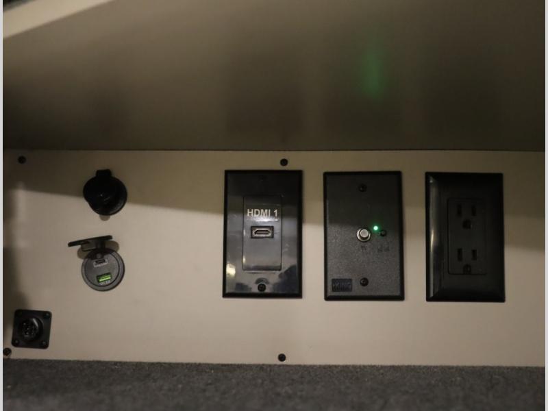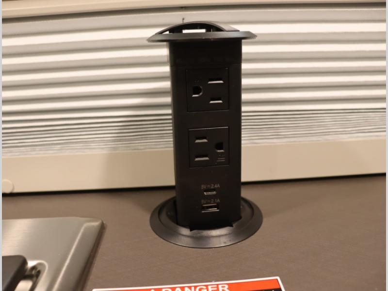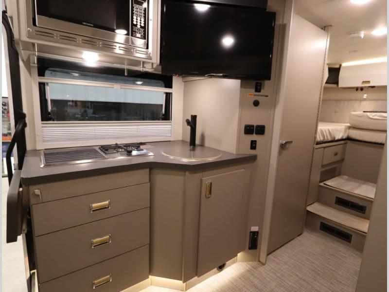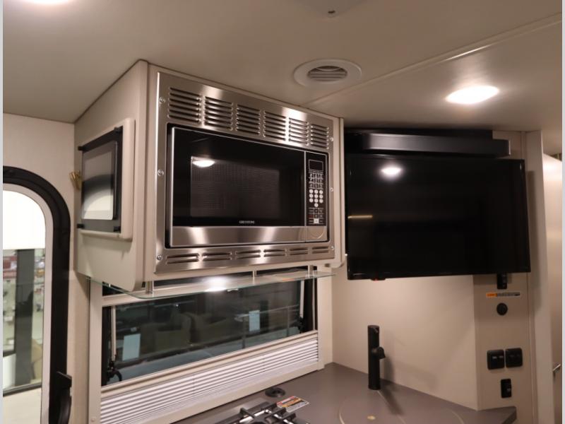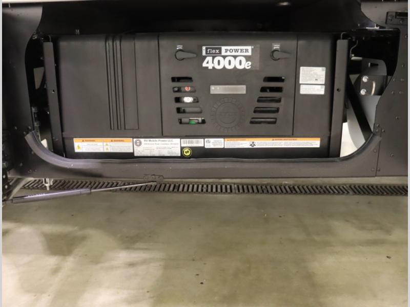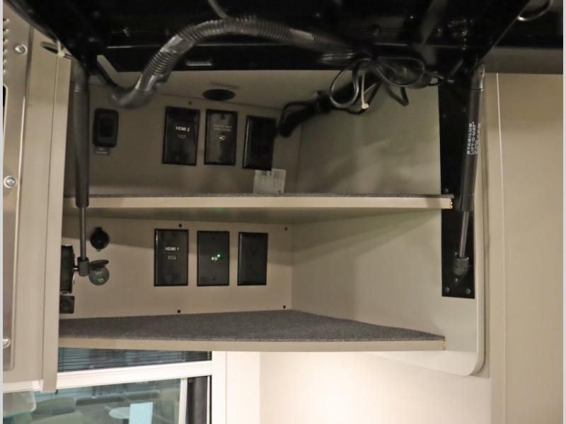 Inside the 24R you'll find a rear twin flex bed system and a home theater lounge setup across from the HDTV. The 24R includes a spacious gear garage with over 81 cu ft of basement storage. The 24R features an even larger inline kitchen and includes a 10 cubic foot compressor driven double door 12V refrigerator and freezer! Replenishing the Lithionics 320 ah battery setup are dual 120 watt solar panels, 240 total, which are also expandable! A 2,000 watt inverter powers household appliances off of the battery bank, including the AC and microwave convection oven!