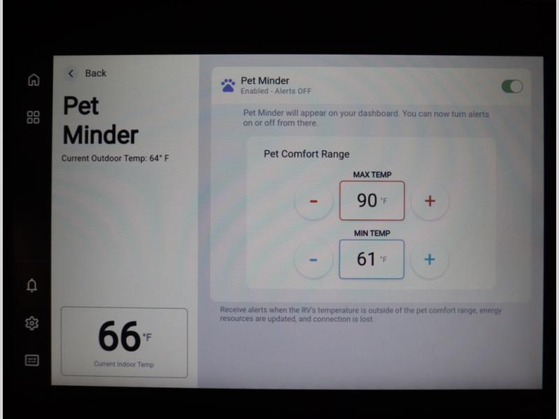 Winnebago Connect keeps a close eye on all vehicle systems, so you can stay focused on the adventure. It even helps you stay aware of climate when you’re away with pets in the RV to notify you as needed for power loss, automatic climate control, smart messaging on systems status, weather, and GPS location services.