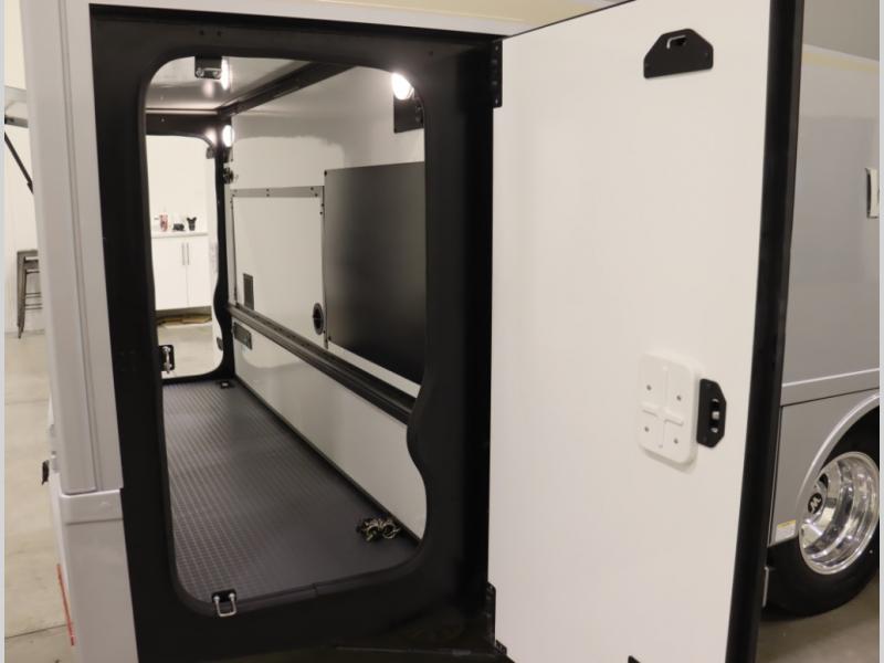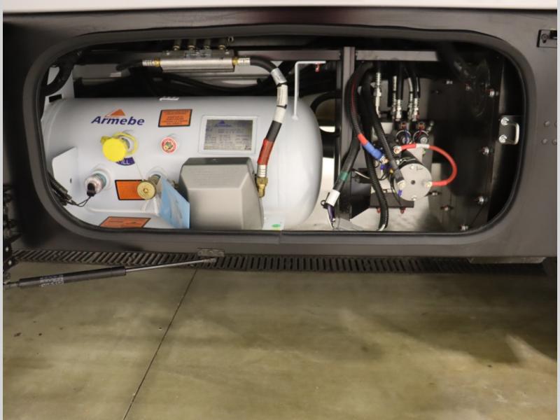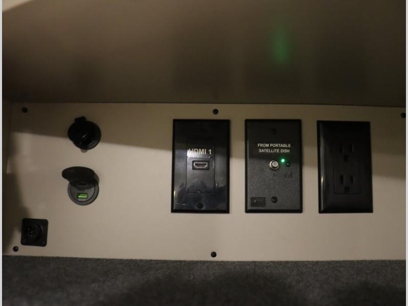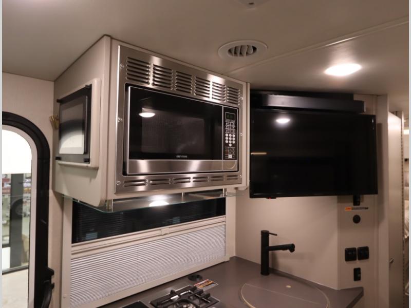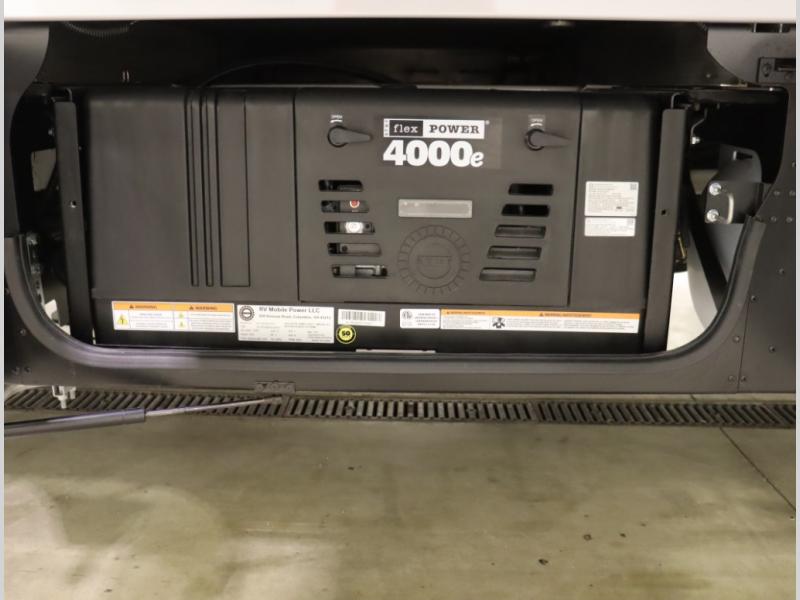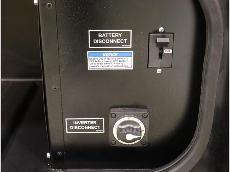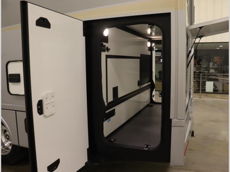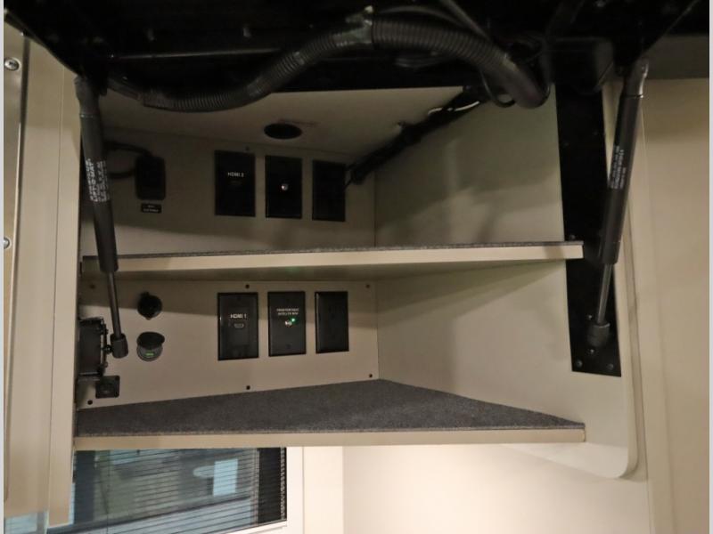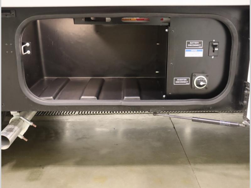 Inside the 24R you'll find a rear twin flex bed system and a home theater lounge setup across from the HDTV. The 24R includes a spacious gear garage with over 81 cu ft of basement storage. The 24R features an even larger inline kitchen and includes a 10 cubic foot compressor driven double door 12V refrigerator and freezer! Replenishing the Lithionics 320 ah battery setup are dual 120 watt solar panels, 240 total, which are also expandable! A 2,000 watt inverter powers household appliances off of the battery bank, including the AC and microwave convection oven!