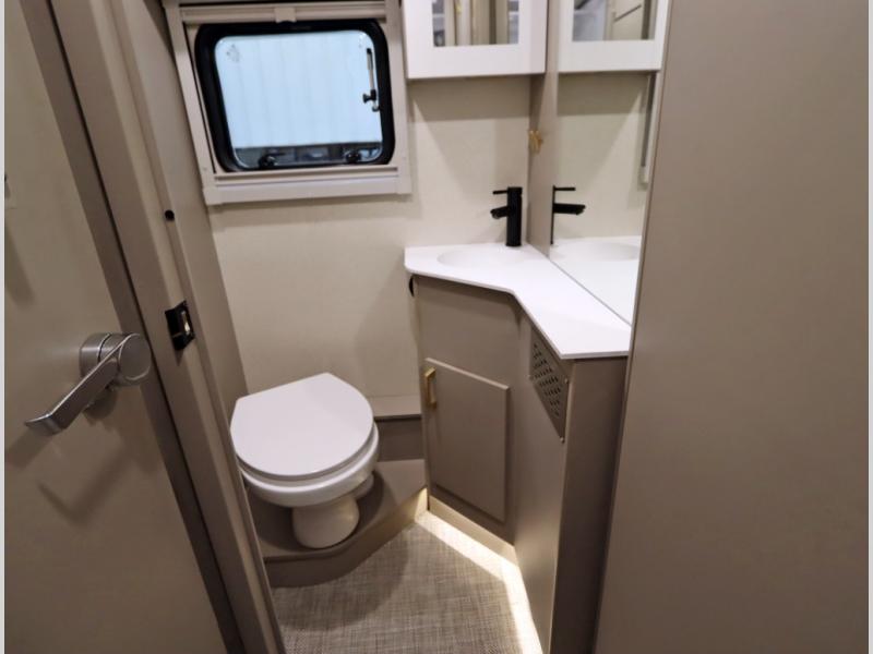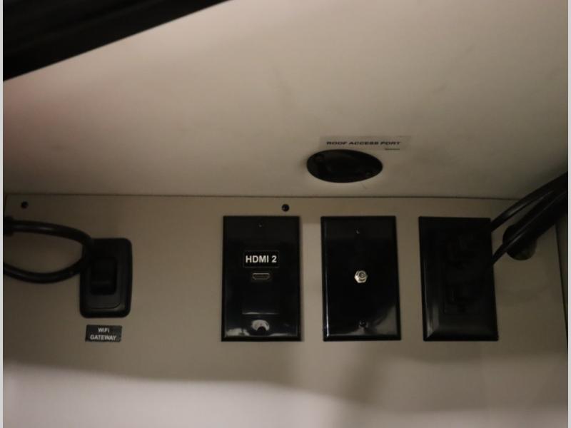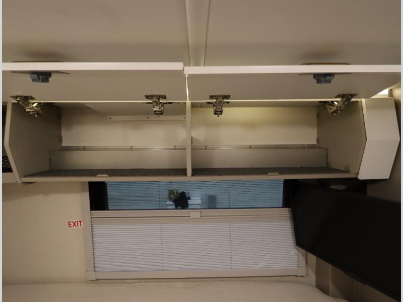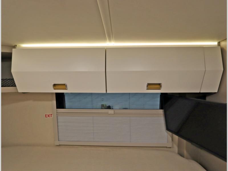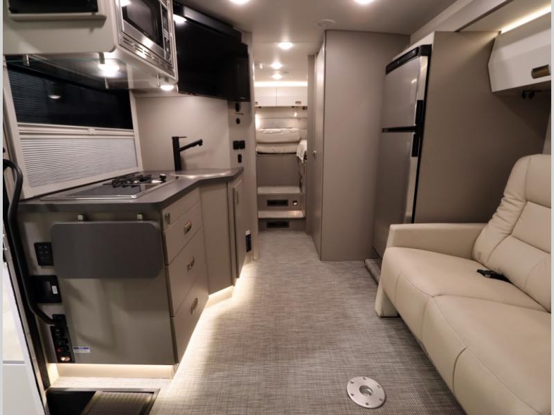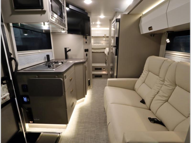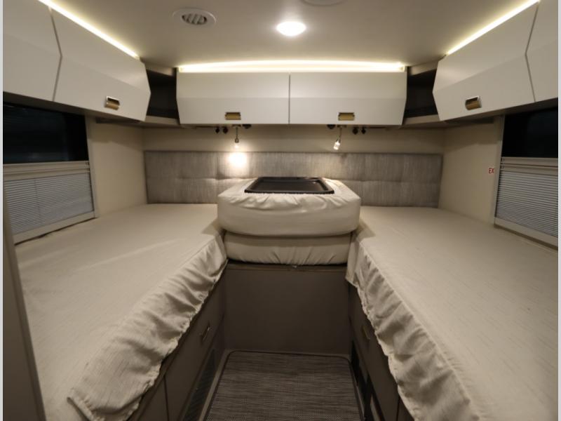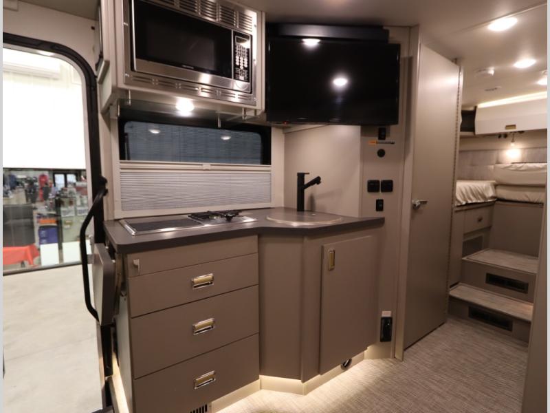 Inside the 24R you'll find a rear twin flex bed system and a home theater lounge setup across from the HDTV. The 24R includes a spacious gear garage with over 81 cu ft of basement storage. The 24R features an even larger inline kitchen and includes a 10 cubic foot compressor driven double door 12V refrigerator and freezer! Replenishing the Lithionics 320 ah battery setup are dual 120 watt solar panels, 240 total, which are also expandable! A 2,000 watt inverter powers household appliances off of the battery bank, including the AC and microwave convection oven!
