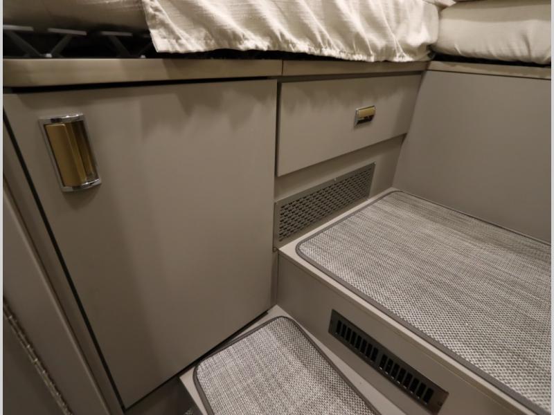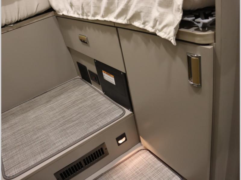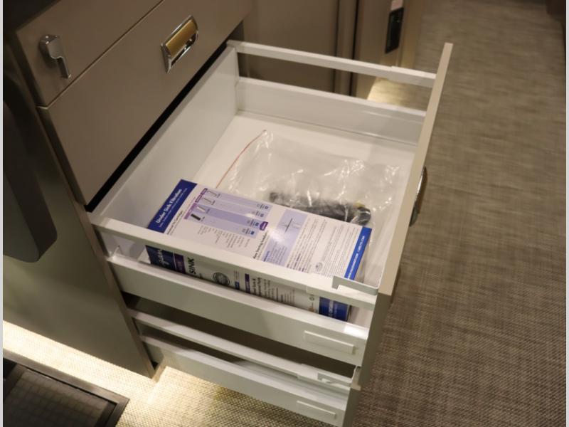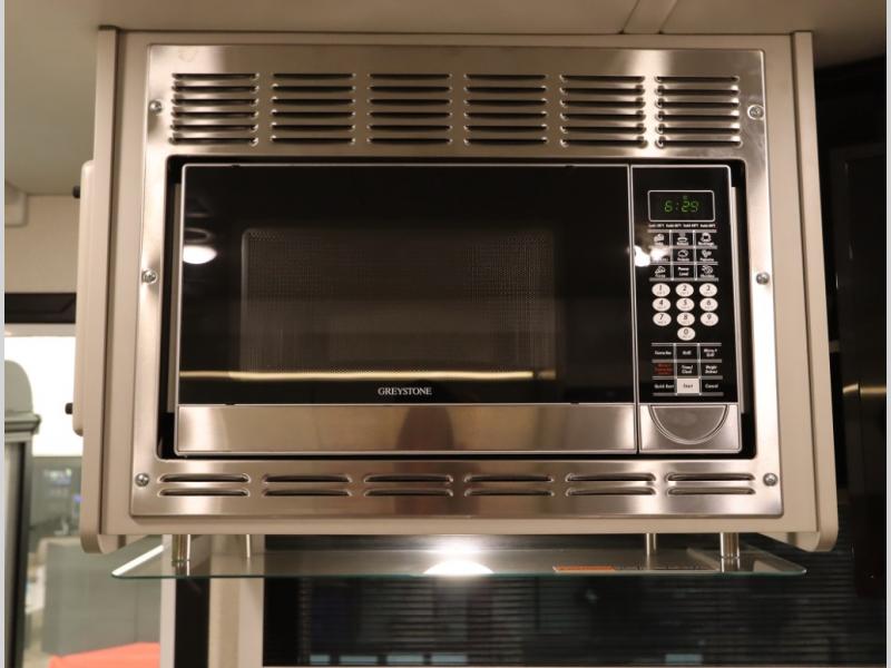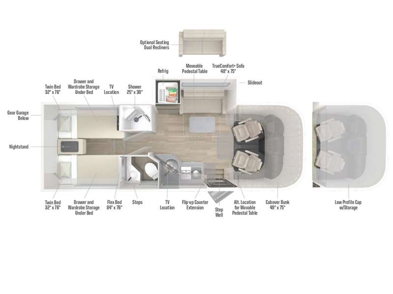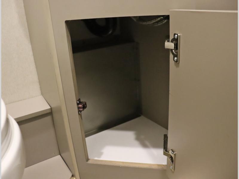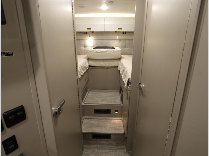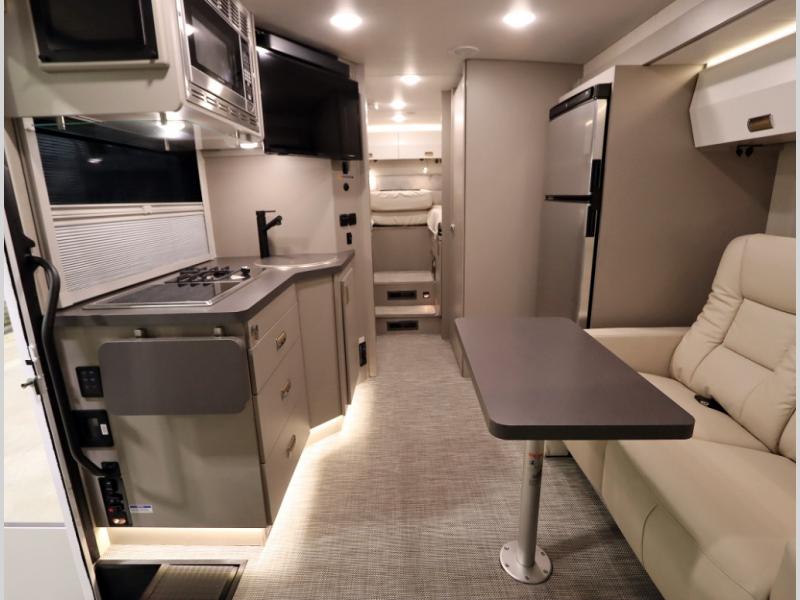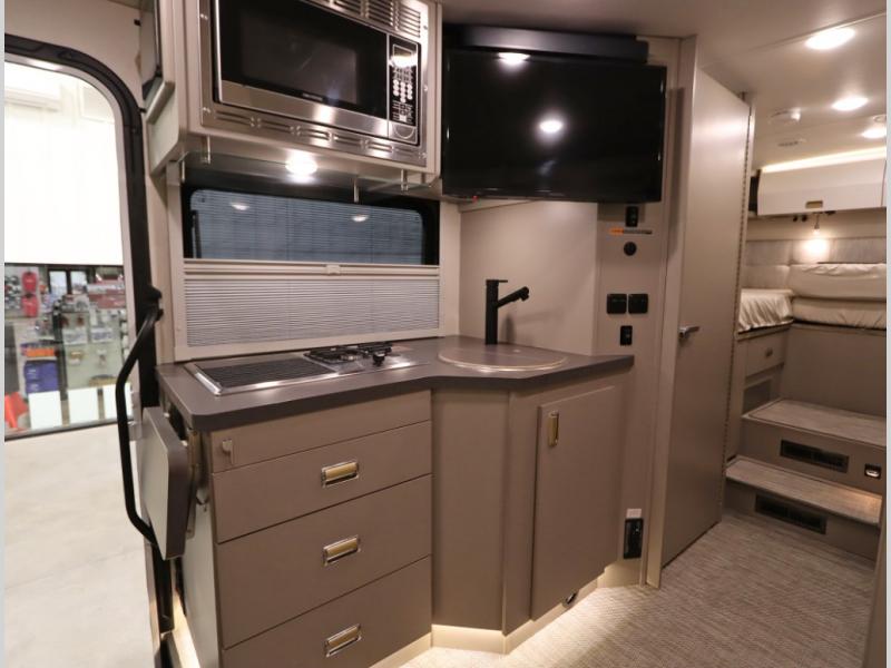 Inside the 24R you'll find a rear twin flex bed system and a home theater lounge setup across from the HDTV. The 24R includes a spacious gear garage with over 81 cu ft of basement storage. The 24R features an even larger inline kitchen and includes a 10 cubic foot compressor driven double door 12V refrigerator and freezer! Replenishing the Lithionics 320 ah battery setup are dual 120 watt solar panels, 240 total, which are also expandable! A 2,000 watt inverter powers household appliances off of the battery bank, including the AC and microwave convection oven!