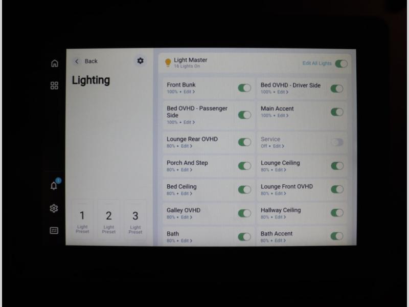 8. 320 ah Lithionics UL 1973 certified lithium battery, expandable and replenished with dual 120 watt, 240 watts total yet expandable if needed, solar, while the coach is in transit or when using shore line power or the generator
