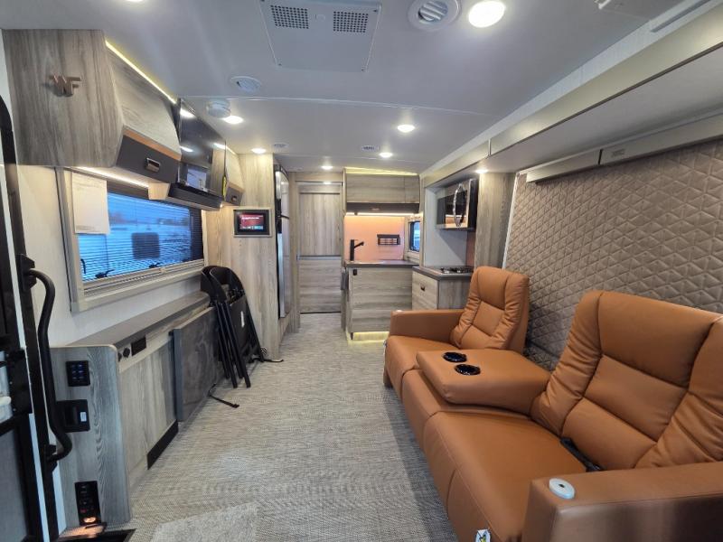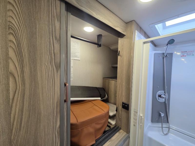 The perfect couples coach or for a family of three or four! You will be able to easily set up the queen Murphy+ bed when it's time for bedtime while the kids or your guests sleep on the 49" x 75" cabover bunk. You can also choose the optional low profile front cap with storage if you do not need the added sleeping space. An optional 3800W RVMP Flex Power generator is also available with this model. Everyone can get cleaned up in the full bathroom that has a space-saving sliding door and large wardrobe along the very rear that features a gear garage below. Create yummy meals and snacks using the kitchen appliances and the flip-up counter, then dine at the fold-down table with chairs, or eat seated on the theater seating with lap tables nearby on either side.