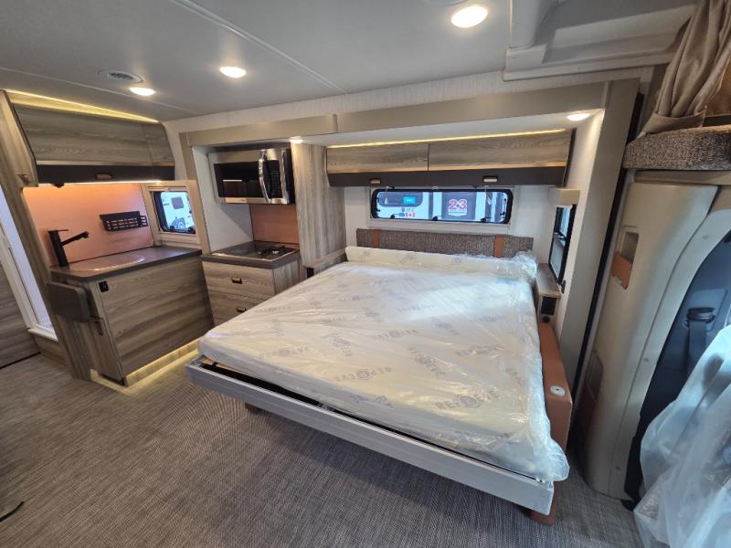The Winnebago View 24T Class C diesel motorhome is functional, innovative, and stylish! You can rule the interstate with the Mercedes-Benz RWD Sprinter chassis, or choose the optional Mercedes-Benz AWD Sprinter chassis to tackle tougher terrain. A Lithium Power Package comes with a 320-amp-hour lithium battery and a dedicated second alternator that will allow you to charge the batteries faster while you're on the road. There are also two 120-watt solar panels to keep you going when you're off-grid. Since there is a heated gear garage with L-track cargo tie-downs, you can bring along two full-size bikes and additional gear for hiking, plus there are 110V/12V charging ports and LED lighting here for added convenience. The contemporary interior features blackout roller shades for the lounge and dining area, woven vinyl flooring throughout, and dimmable LED lighting. There is also a Winnebago Connect that is integrated into your Winnebago app that acts as your RV companion. Now you can stay informed on vehicle system alerts, travel prep resources, energy management, and more!