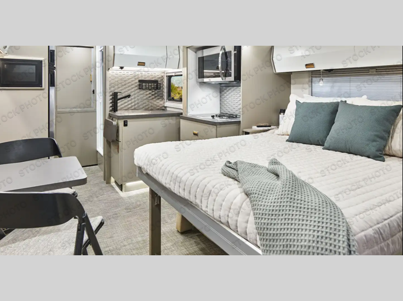 The perfect couples coach or for a family of three or four! You will be able to easily set up the queen Murphy+ bed when it's time for bedtime while the kids or your guests sleep on the 49" x 75" cabover bunk. You can also choose the optional low profile front cap with storage if you do not need the added sleeping space. Everyone can get cleaned up in the full bathroom that has a space-saving sliding door and large wardrobe along the very rear that features a gear garage below. Create yummy meals and snacks using the kitchen appliances and the flip-up counter, then dine at the fold-down table with chairs or eat seated on the theater seating with lap tables nearby on either side.
