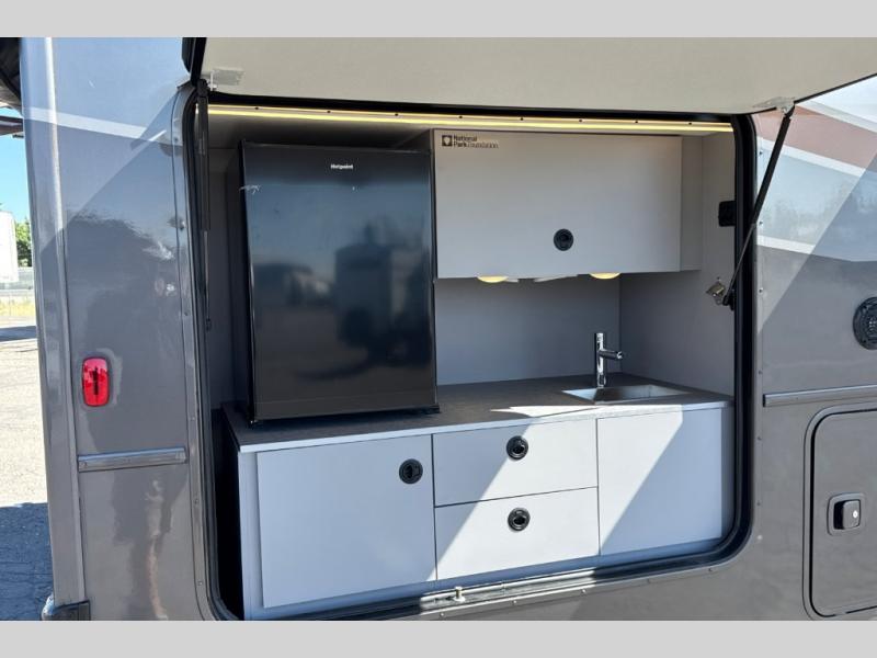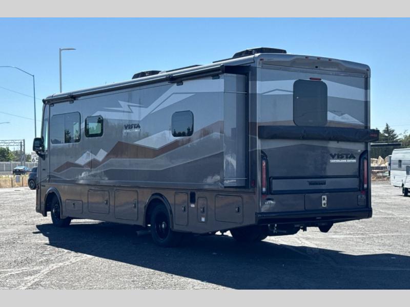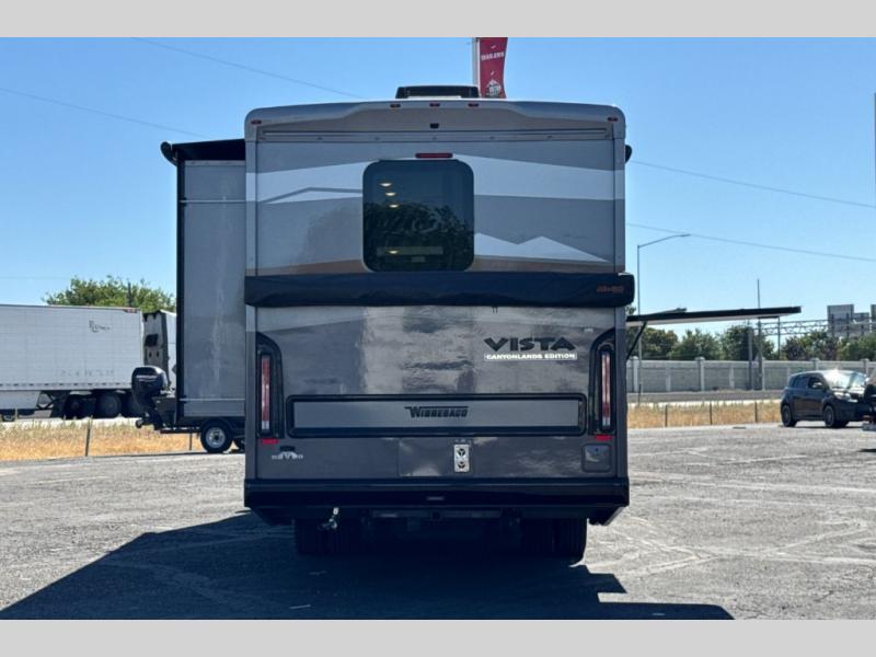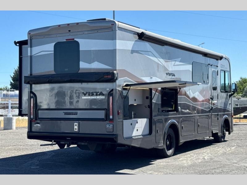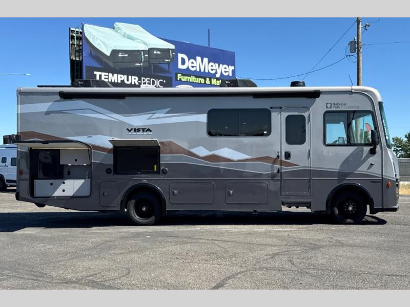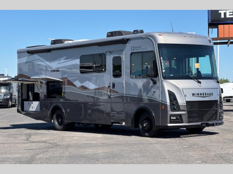 The Winnebago Vista National Park Foundation Limited Edition Class A gas motorhome is designed to fit almost any campsite! You can go off the grid with the upgraded solar energy system which has a standard 320 amp hour lithium-ion battery, a charge controller, and three solar panels for three times the unplugged power. The Batwing awning overlaps the standard armless patio awning for two sides of seamless wraparound protection to enhance your outdoor living. Speaking of enhanced outdoor living, the exterior kitchen included in the Tailgate package comes with a refrigerator, a sink, and a quick connect LP hose for a portable stove or grill, plus more convenient accessories. The outdoors are brought inside through the frameless tinted windows and the beautiful Salinas oak cabinets. Come check it out today!