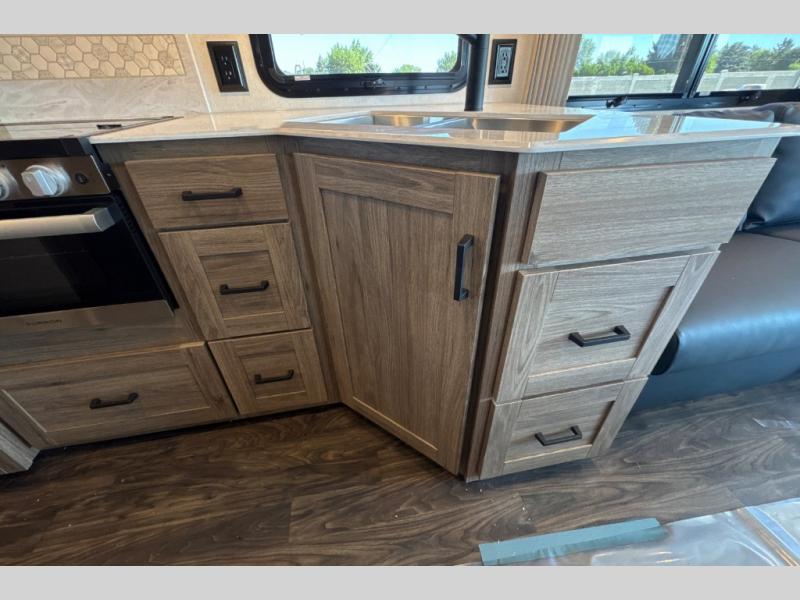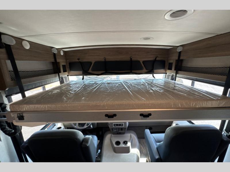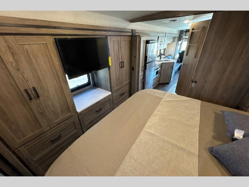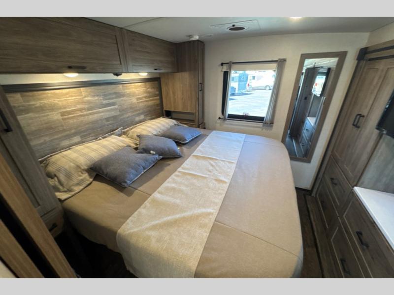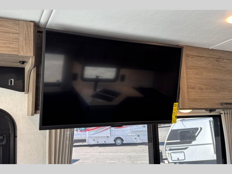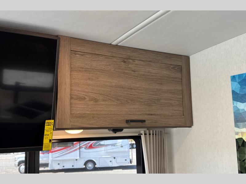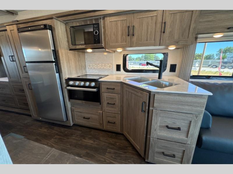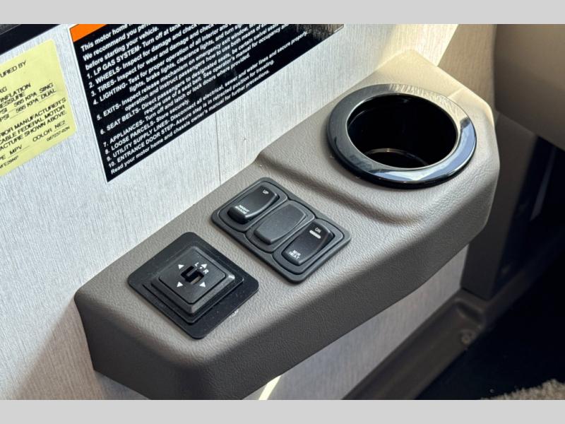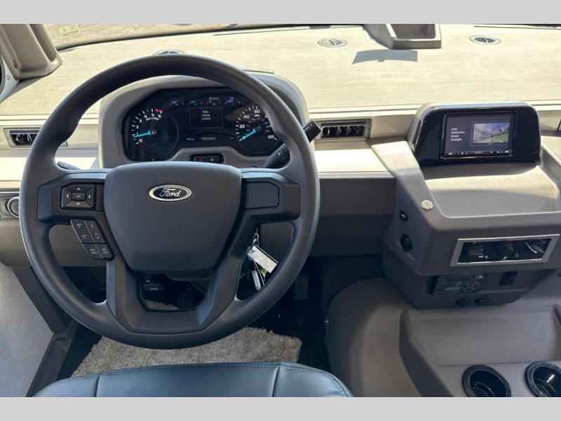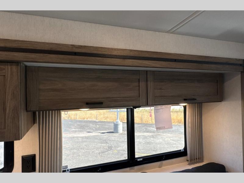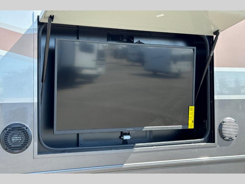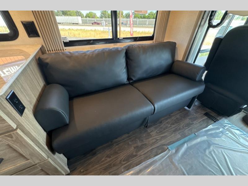 Head to your favorite destinations with this motorhome! You can travel with your spouse or bring an extra guest or two when you add the optional StudioLoft 50" x 80" powered bed above the cab. The 40" x 66" sofa bed can also transform into an extra sleeping space but if you don't need it then you can switch it out for the optional theater seating. Enjoy delicious home cooked meals while on the road with the three burner cooktop or head to the exterior kitchen to breathe in some fresh air while you cook. Eat your meals at the 42" x 70" dinette with Hi-Lo table and freshen up each morning in the full bathroom featuring a 26" x 38" shower. The rear private bedroom has a 72" x 75" king bed to lay your head on at night and wardrobes on either side of a storage area with a location for an optional TV to be added!