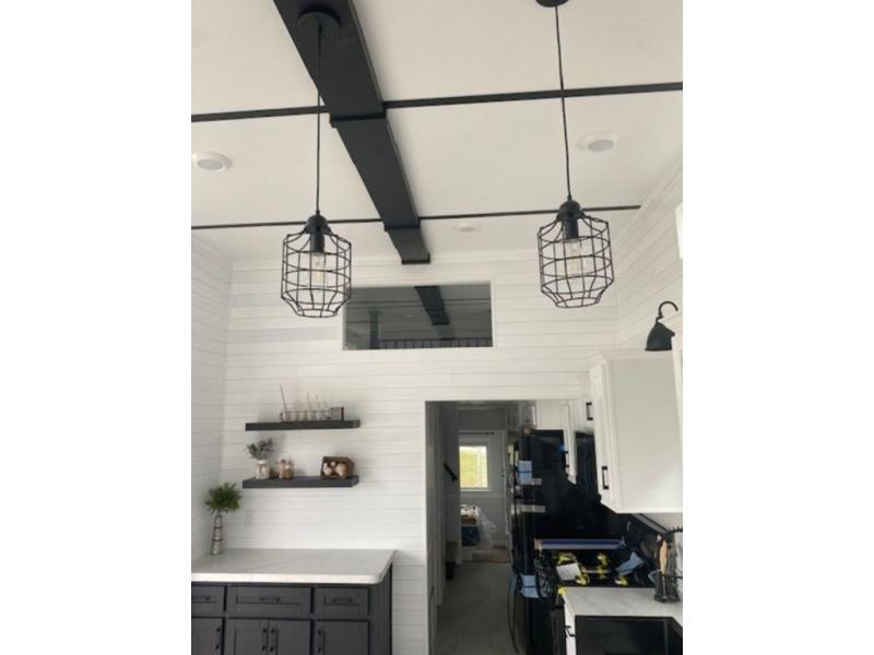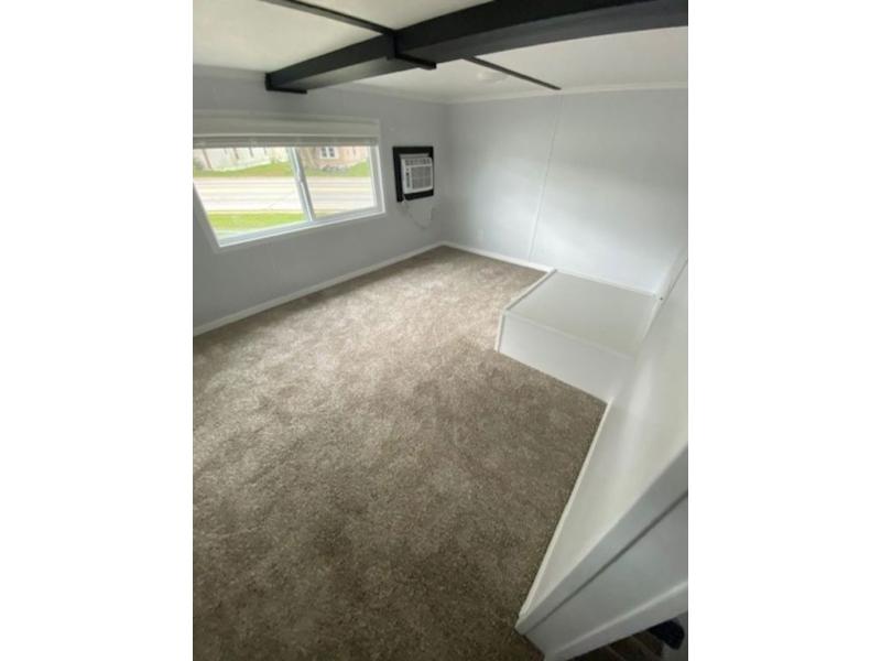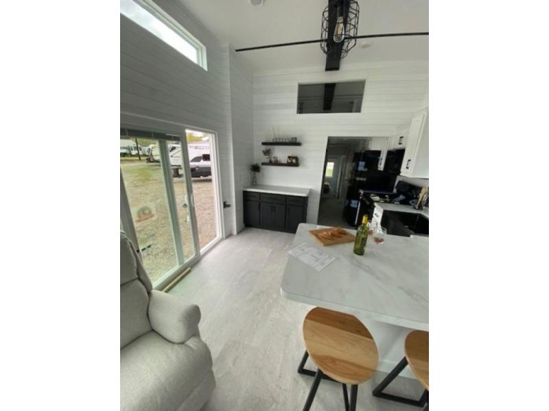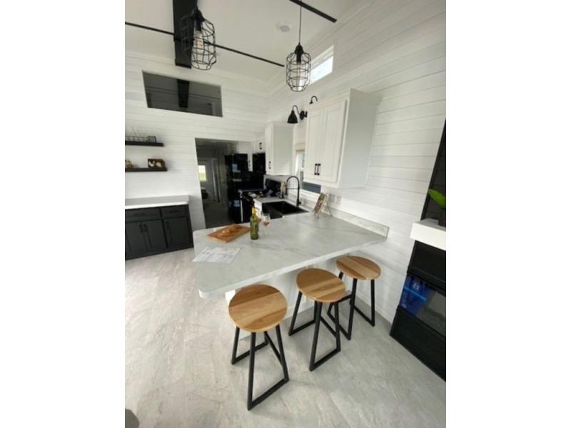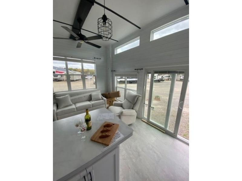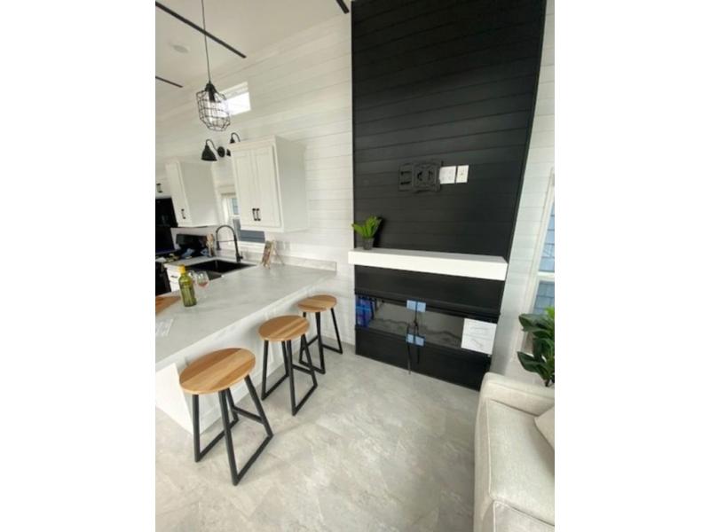 Shed dormers add character to this park model from Timber Ridge. The second story loft area adds extra space, while the private rear bedroom is a secluded retreat. You will appreciate the night stands with USB ports, dual wardrobes, and LED lights. The open living area features an entertainment center with bookshelf and wall-mounted TV, which you can also watch from the three stools at the breakfast bar in the kitchen. A 72" x 76" patio door provides a welcoming entry complete with a porch light.