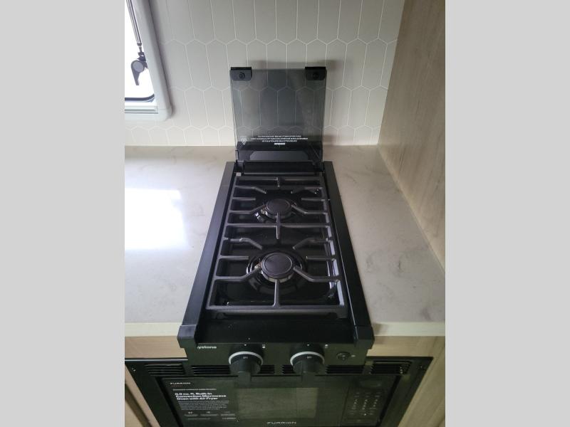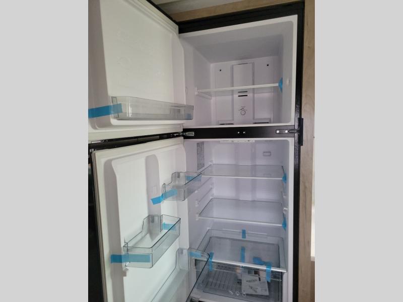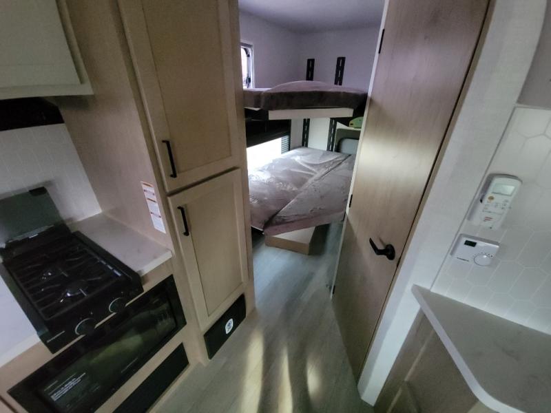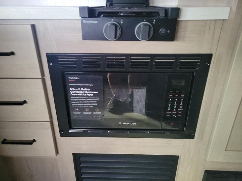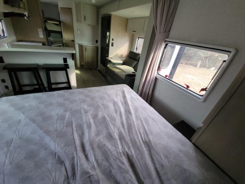 You will love camping in this versatile travel trailer! There is a repositionable EmberTrack E-Track bunk/storage system with single and double-size bunk configurations, depending on your needs, plus a fold-up Bar-V window that overlooks the exterior fold-down bar top/door. You'll find your own semi-private bedroom up front with a walk-around queen bed, dual nightstands and wardrobes, plus an overhead cabinet for ample storage. An optional Murphy bed can be chosen in place of the queen bed if you're needing more seating space during the day! The dual-burner LP cooktop and air fryer convection microwave will let you make meals each day, and there is a breakfast bar with bar stools where you can dine together. This unit also includes a slide out with theater seating with rotating side tables for the ultimate place to relax, plus there is a 12V refrigerator and overhead cabinet here for more storge space!