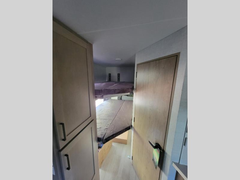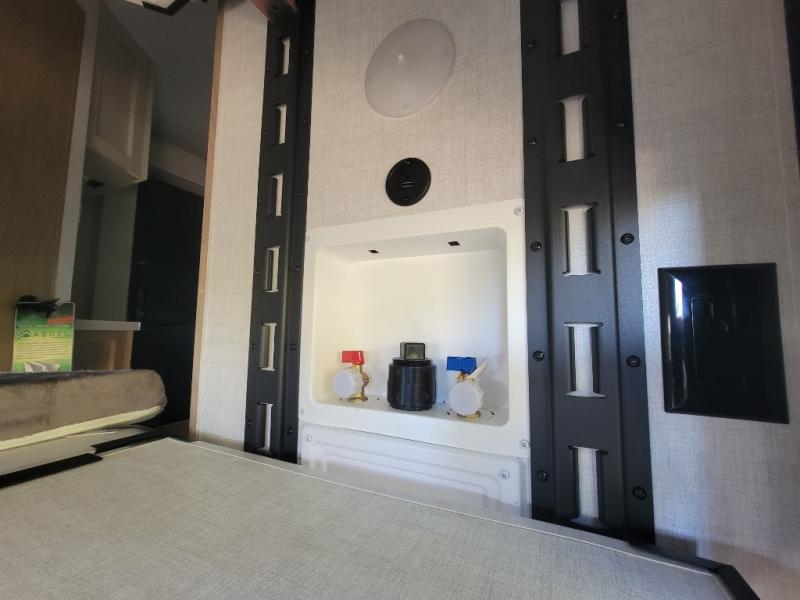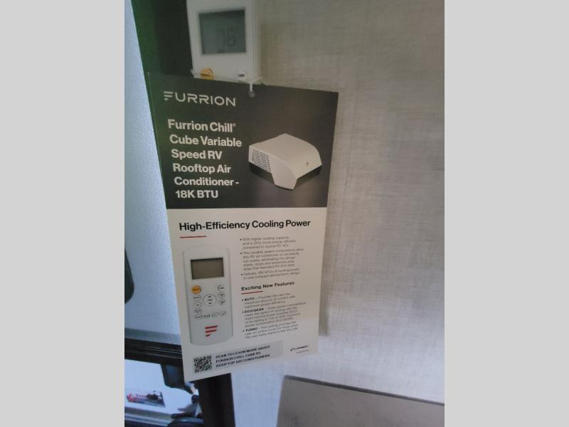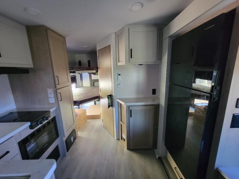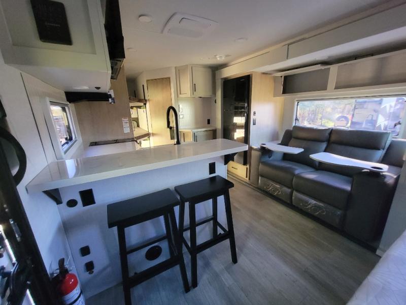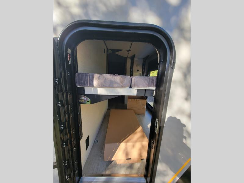 You will love camping in this versatile travel trailer! There is a repositionable EmberTrack E-Track bunk/storage system with single and double-size bunk configurations, depending on your needs, plus a fold-up Bar-V window that overlooks the exterior fold-down bar top/door. You'll find your own semi-private bedroom up front with a walk-around queen bed, dual nightstands and wardrobes, plus an overhead cabinet for ample storage. An optional Murphy bed can be chosen in place of the queen bed if you're needing more seating space during the day! The dual-burner LP cooktop and air fryer convection microwave will let you make meals each day, and there is a breakfast bar with bar stools where you can dine together. This unit also includes a slide out with theater seating with rotating side tables for the ultimate place to relax, plus there is a 12V refrigerator and overhead cabinet here for more storge space!