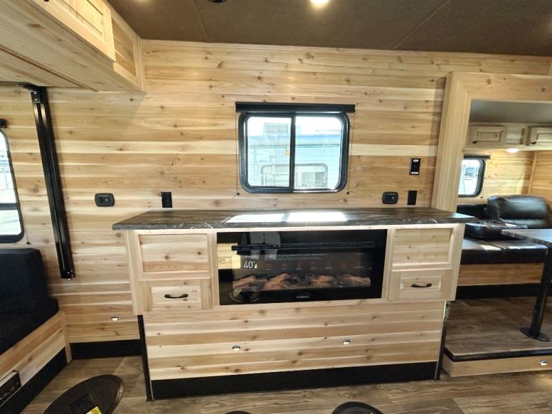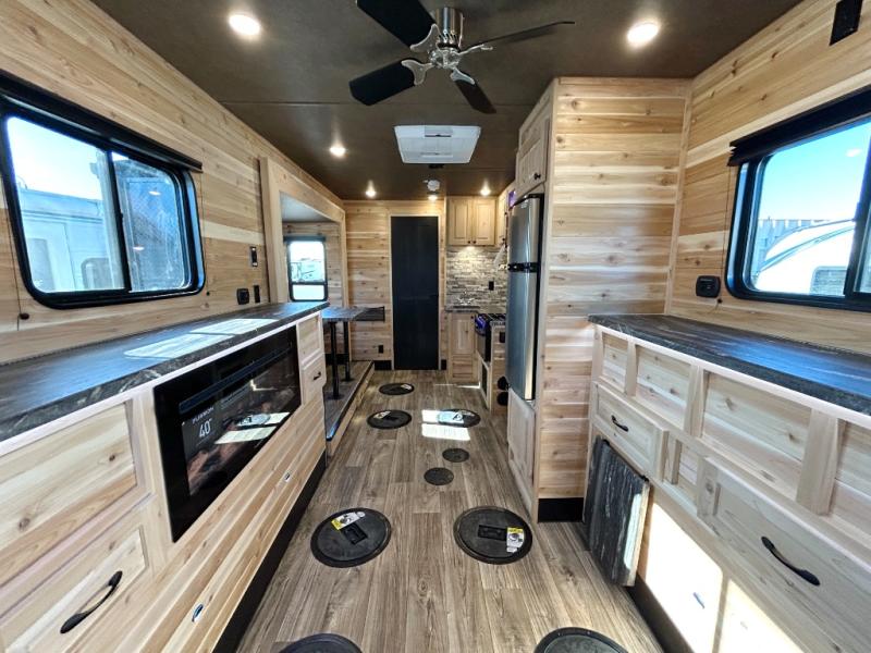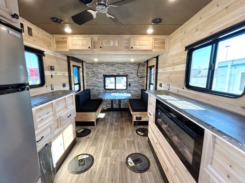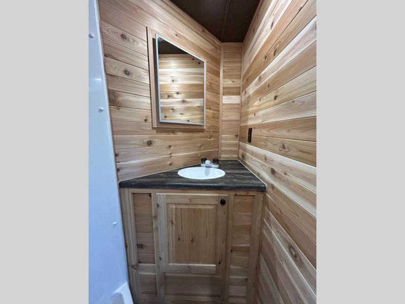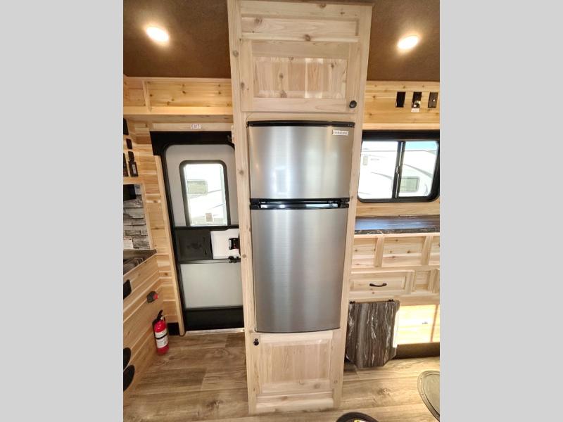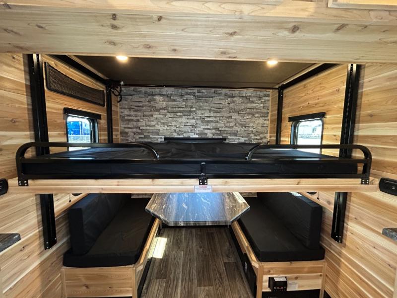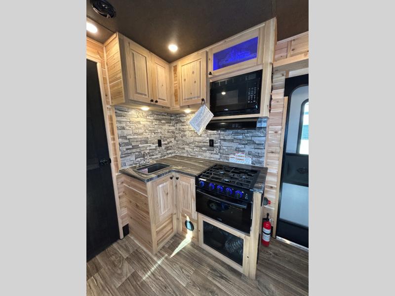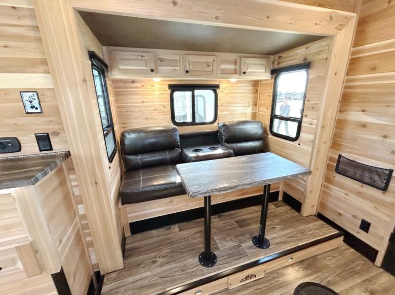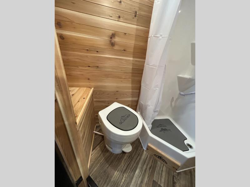 After fishing from one of the ice holes, you can make dinner on the three-burner range with an oven, grab your drinks from the 4.5-cu. ft. 12V refrigerator and dine at sofa with a table in the rear. Everyone can take turns getting cleaned up in the front full bathroom before retiring to the sofa and bunk. This model also includes overhead cabinets for storage, a microwave oven above the range, a 30k BTU forced air furnace, and many more stand-out features.