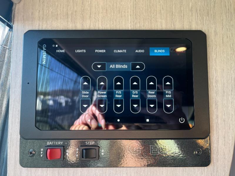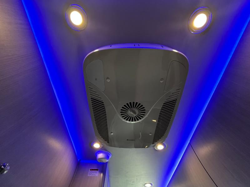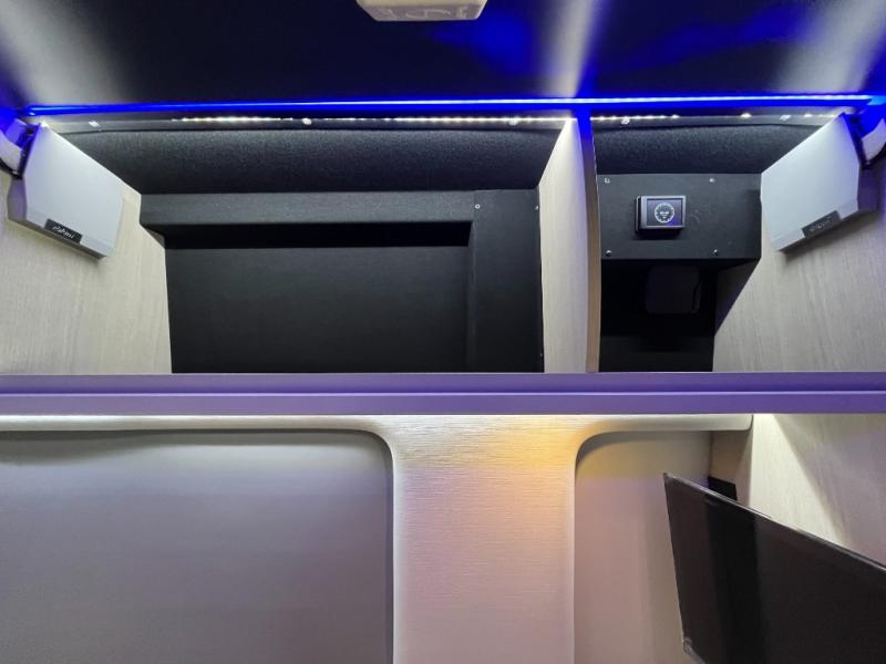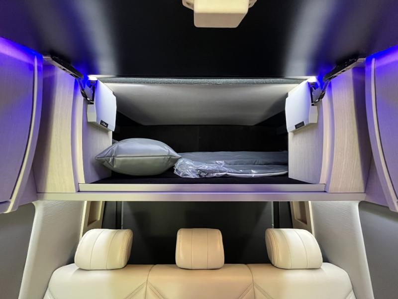 Inside, the Strada-ion Tour is designed with a sophisticated lounge layout that transforms effortlessly from daytime seating to nighttime comfort. The rear seating area converts into a power sofa bed, creating a relaxing sleeping space while allowing the interior to function as a comfortable touring lounge during the day. Premium Ultraleather seating surfaces, hardwood cabinetry, soft-touch walls, and ambient LED lighting create a refined interior atmosphere that reflects Grech’s reputation for luxury craftsmanship.