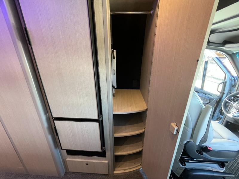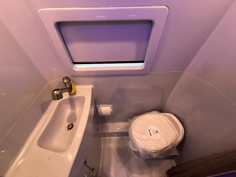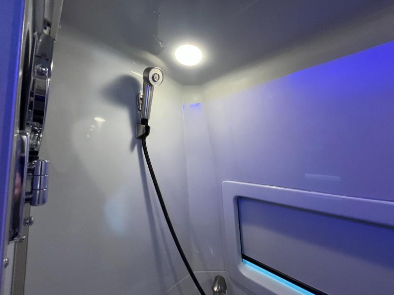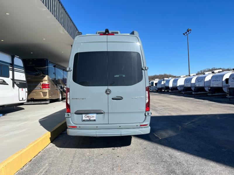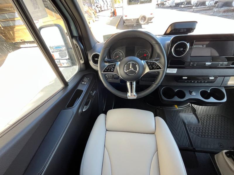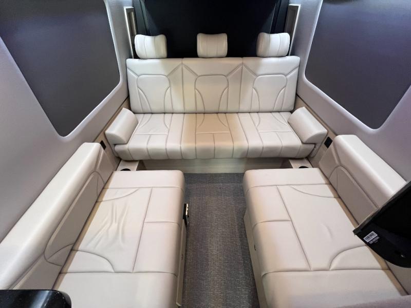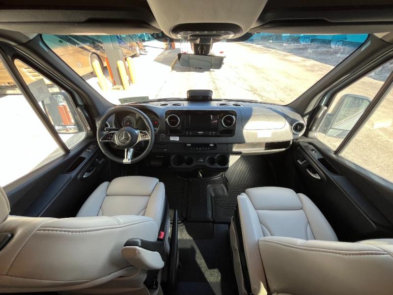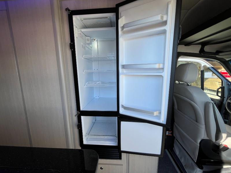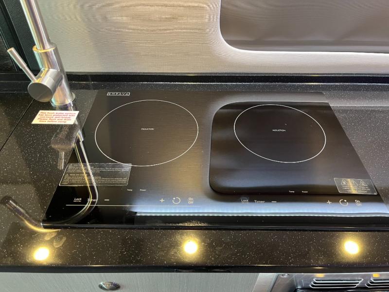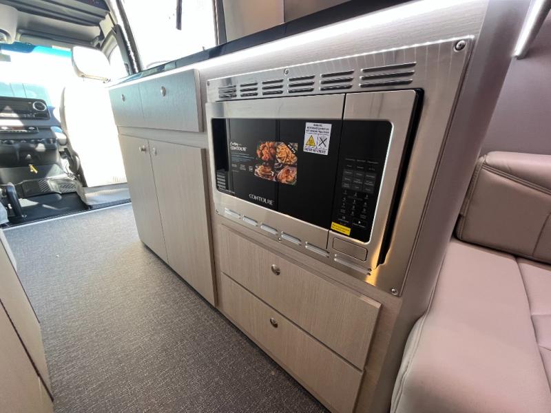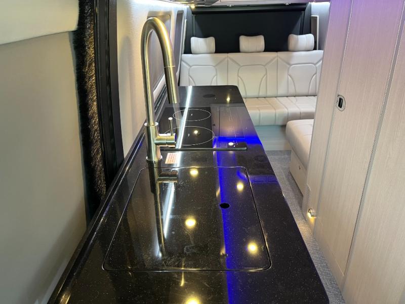 The kitchen area is compact yet fully functional, featuring a two-burner induction cooktop, refrigerator, convection microwave, and solid surface countertops for preparing meals on the road. A private wet bath with window and shower provides convenient bathroom facilities while maintaining the efficient layout expected in a premium touring van.