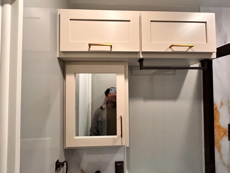 - SLIDING GLASS DOOR, LED SOLID-SURFACE VANITY SINK WITH OVERHEAD MEDICINE CABINET +