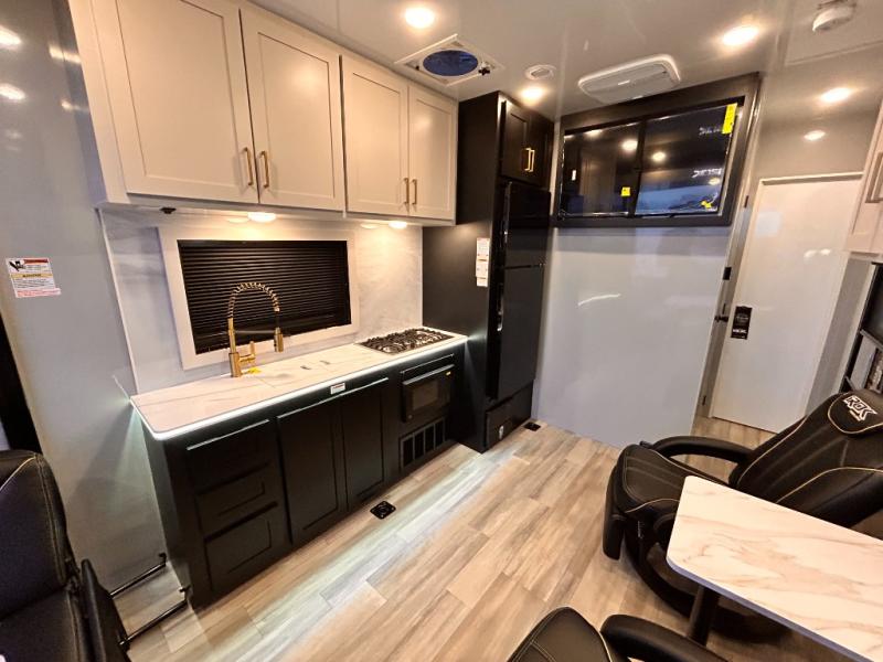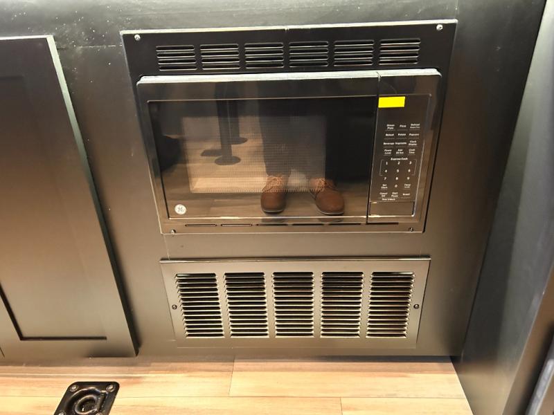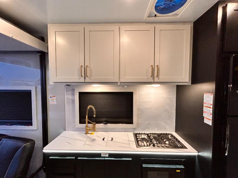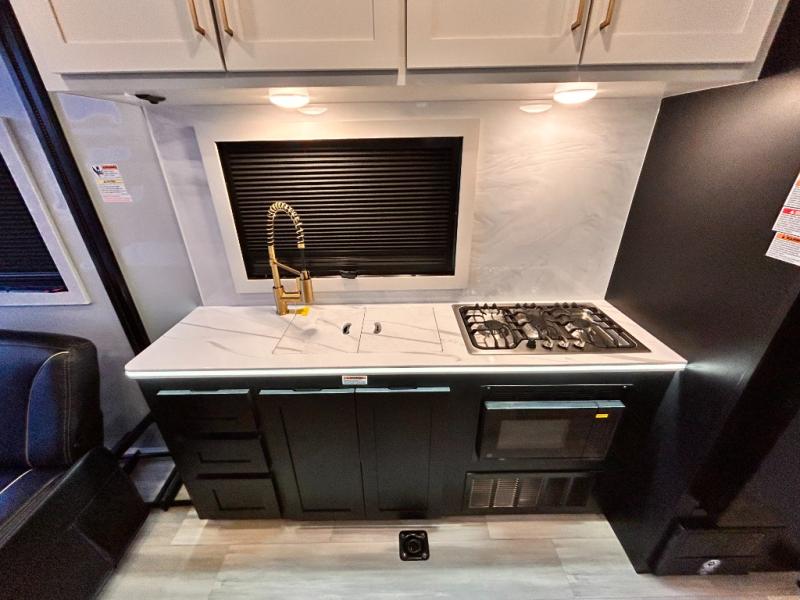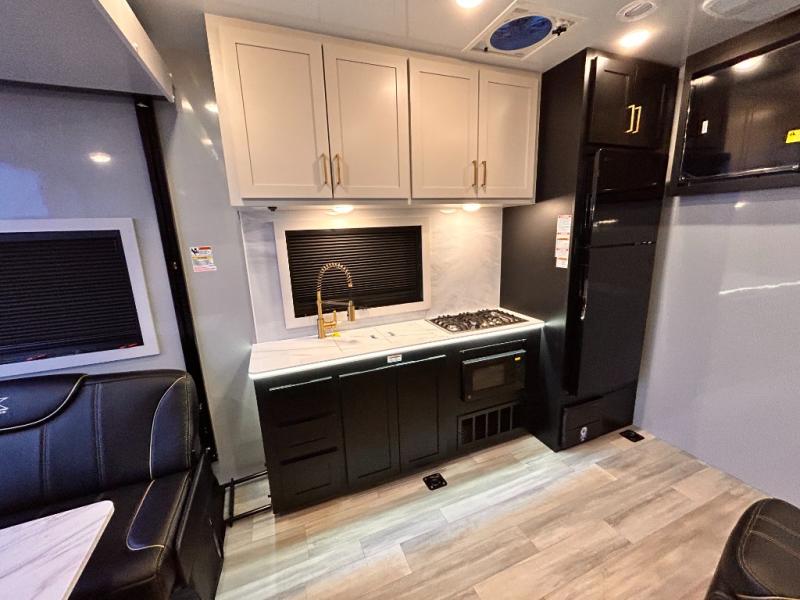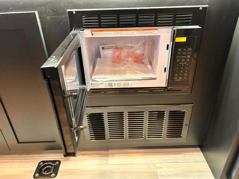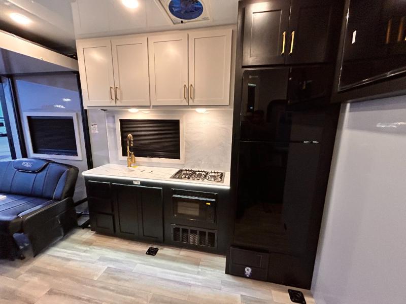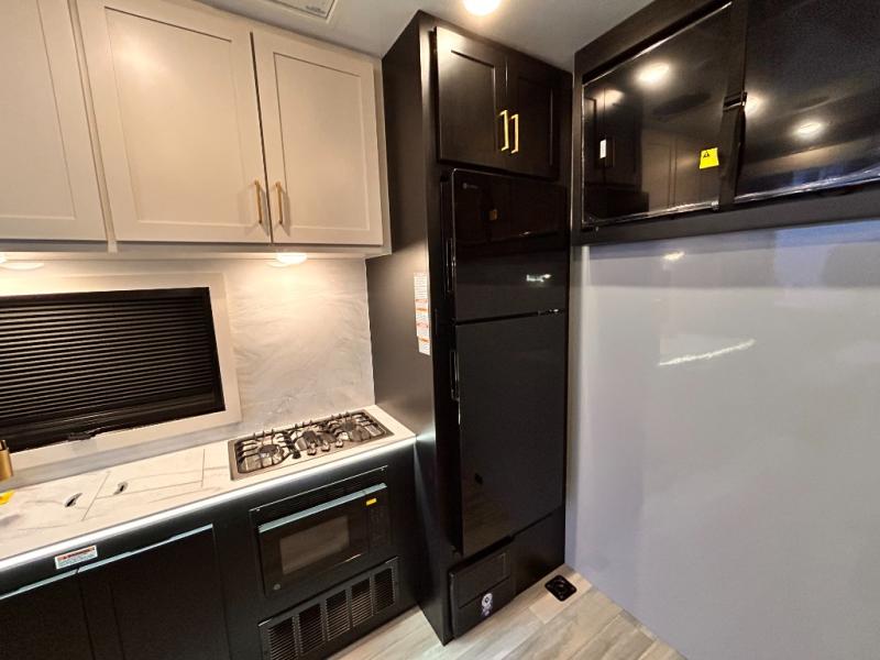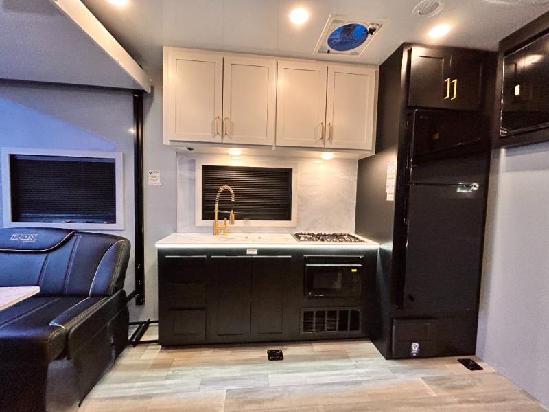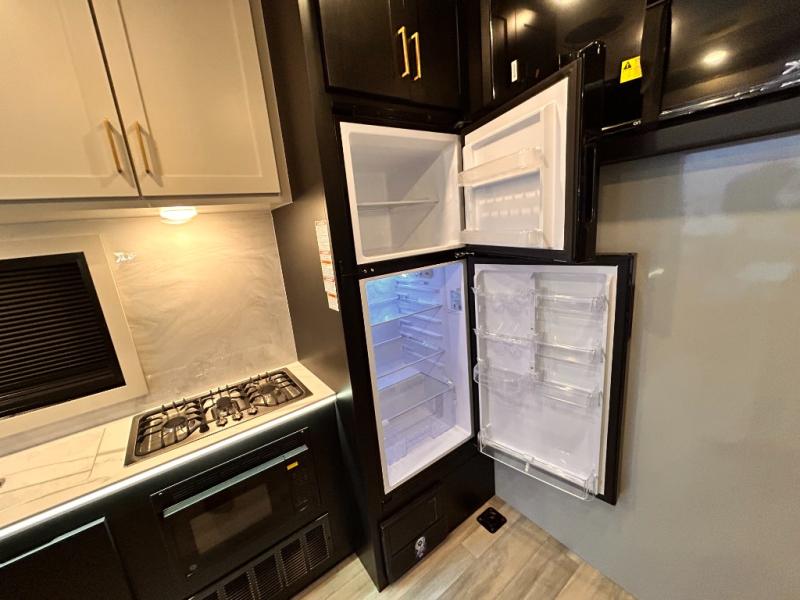 - KITCHEN: 10.7 CU FT 12 VOLT REFRIGERATOR, MICROWAVE, 3-BURNER COOKTOP, CHEF’S