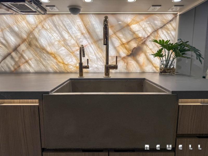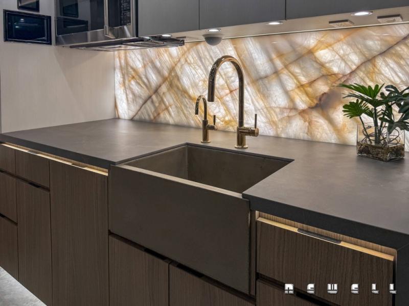 Premium backlit quartz at galley backsplash