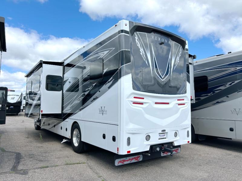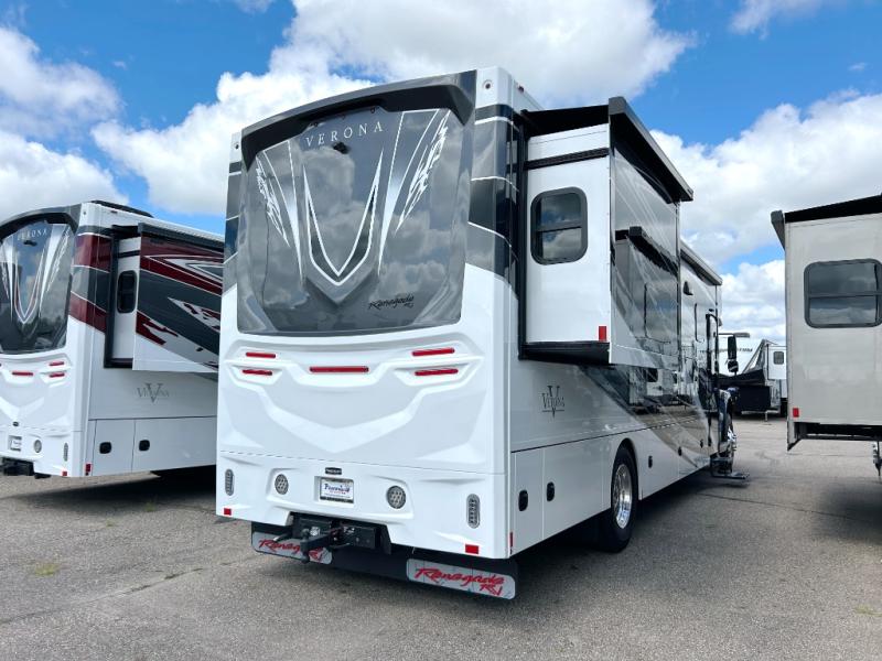 With any Renegade Verona Super C diesel motorhome, you will have confidence to explore the open road! The Cummins 360HP 3200TRV Allison transmission gives you the power and performance to travel anywhere, and the 3000-watt true sine wave inverter makes this an electric coach, plus the aluminum automotive cab construction is designed and tested for occupant protection. The interior boast about the solid hardwood cabinets including every cabinet stile and passage door are made from hardwood for true residential craftsmanship and the articulating cabinet hinges complete the package. More luxurious features include the solid surface countertops, the memory foam mattress, and the wavy patterned fiberglass shower with a glass door. Choose extreme luxury, purpose and durability; take a Verona on the road today!