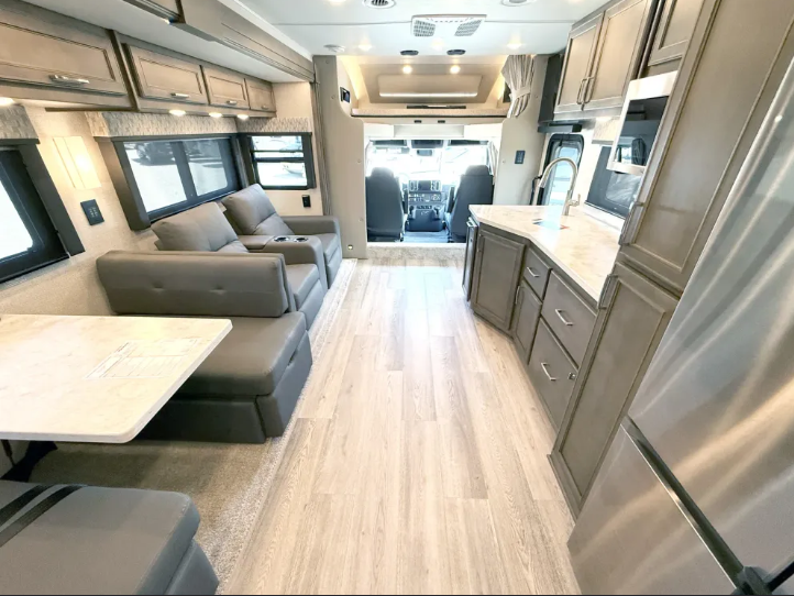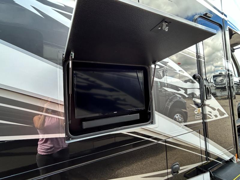 Whether you travel while you work or enjoy long-trips in your RV, this coach provides all the luxury, flexibility and comfort you could want! The main living and kitchen area is spacious with a furniture slide which includes a booth dinette which offers sleeping space when needed for guests. The cook will love using the stainless steel convection microwave oven and the induction cooktop when making meals, and the French door residential refrigerator will hold lots of cold food. The separated bathroom allows two people to get ready at once, and the mini-king bed slide gives you more floor space in the bedroom to get to the closets and dresser. You will find a 32" 4K Smart LED TV in the bedroom to watch before bedtime, and the exterior offers a 32" LED TV to watch the big game while relaxing under the electric awning with LED lights. And you might like to add the washer/dryer option to the prepped closet to keep everything clean while on the road.