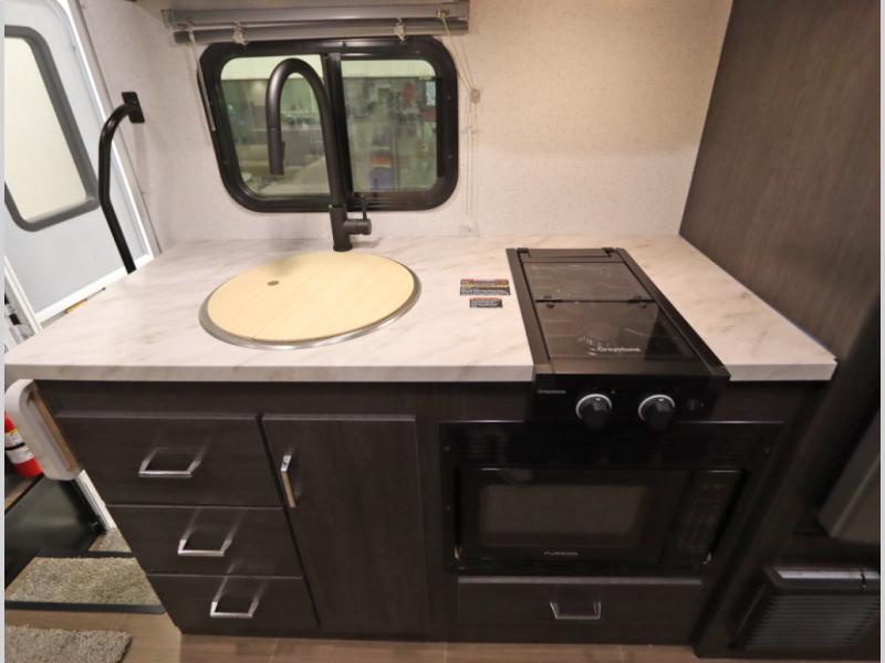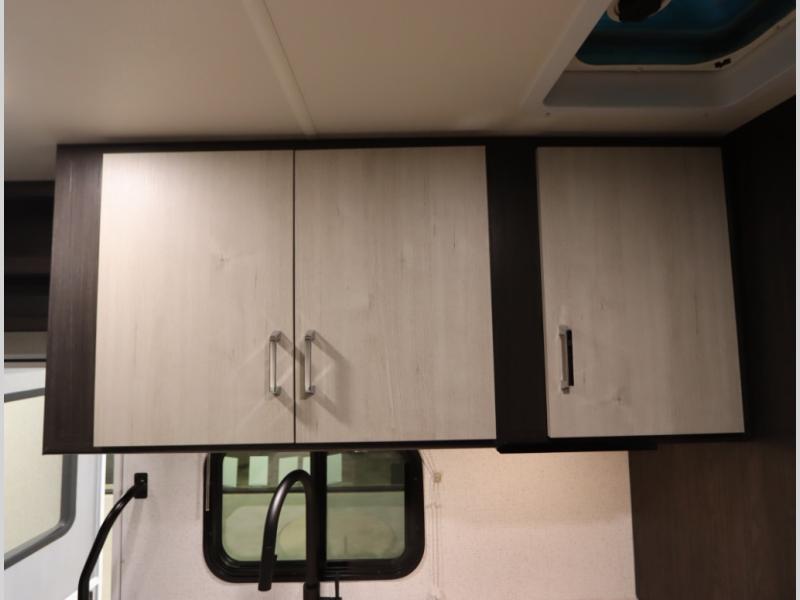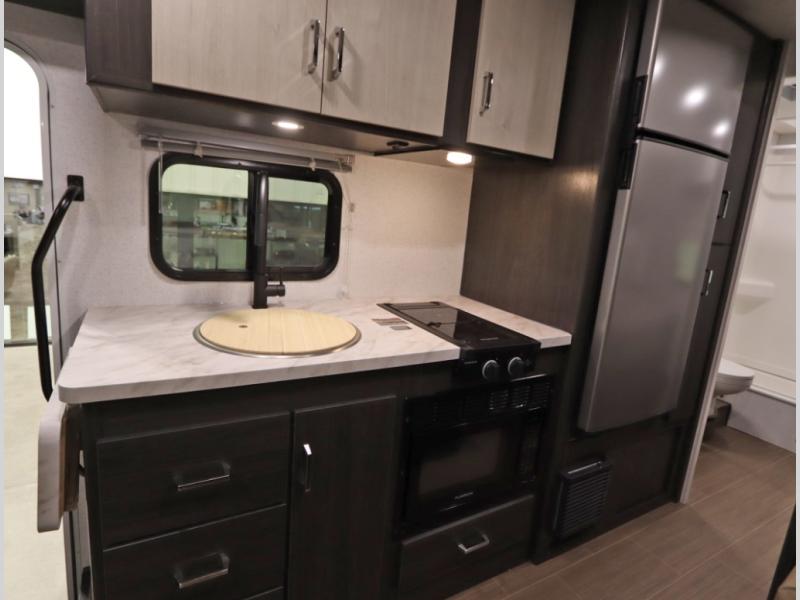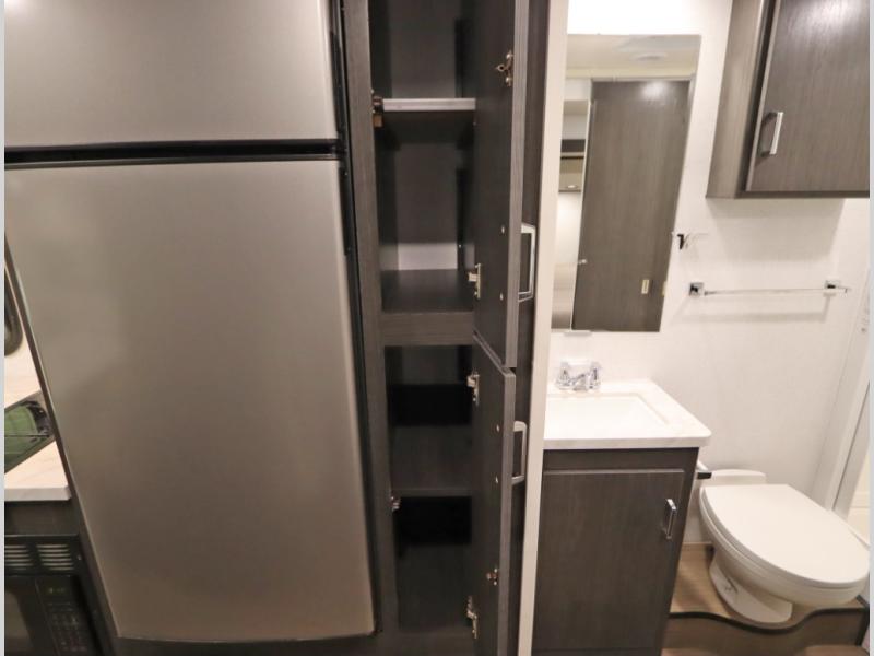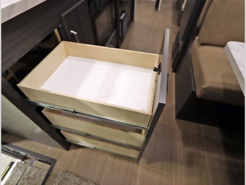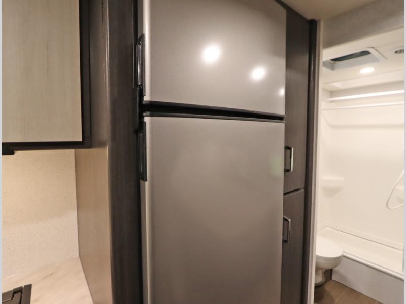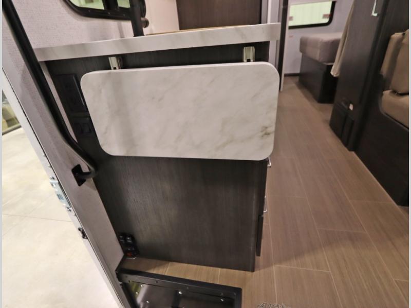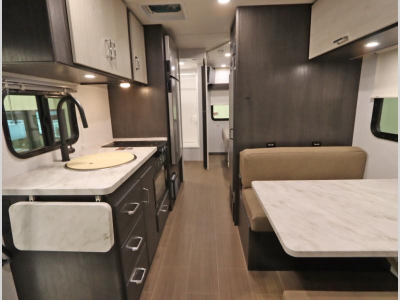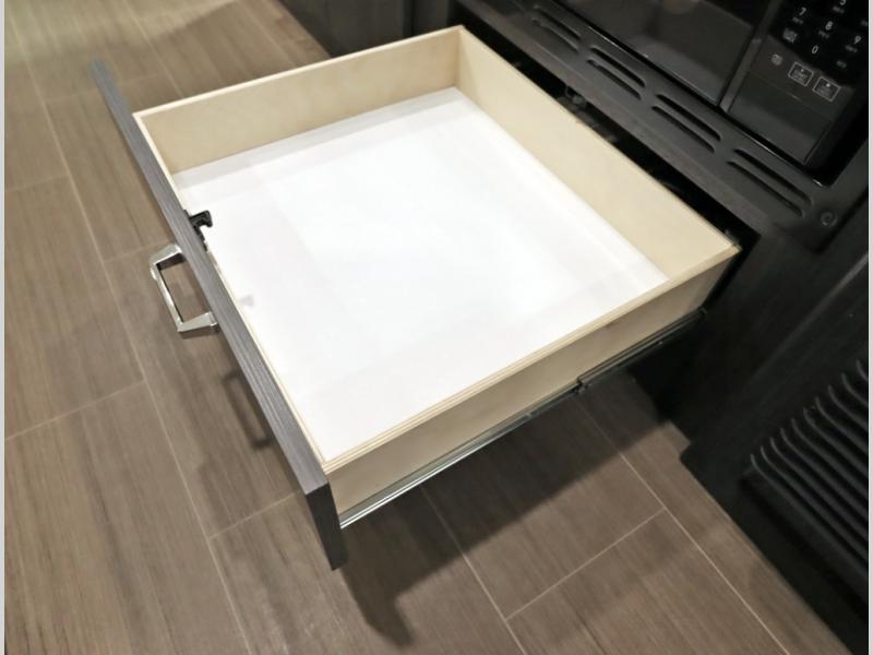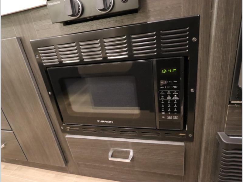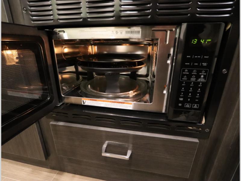 Convenient Amenities: The convection microwave with a built-in air fryer saves space, while flat floor designs enhance movement throughout the coach.