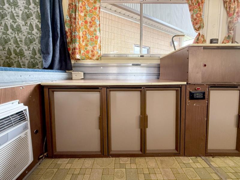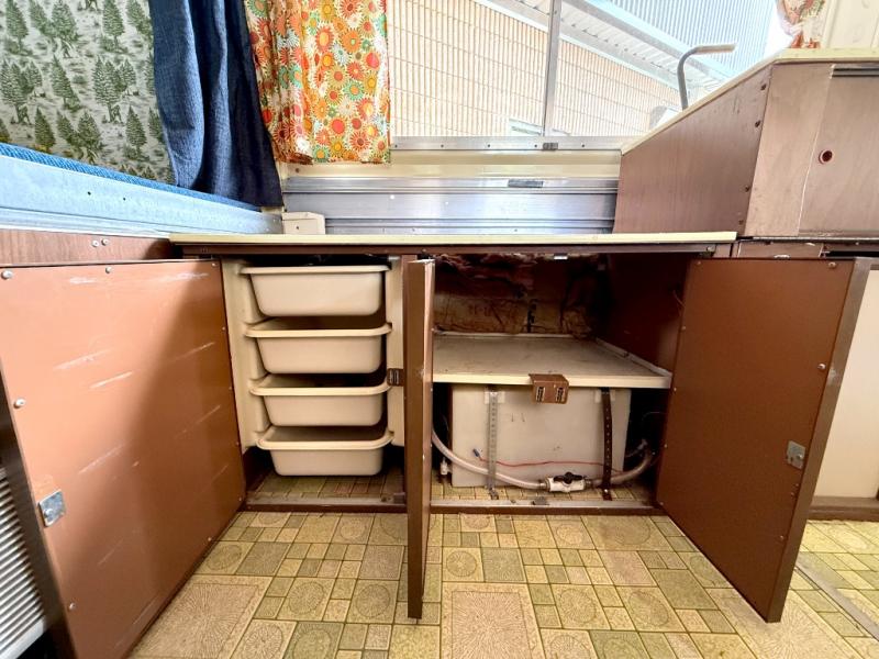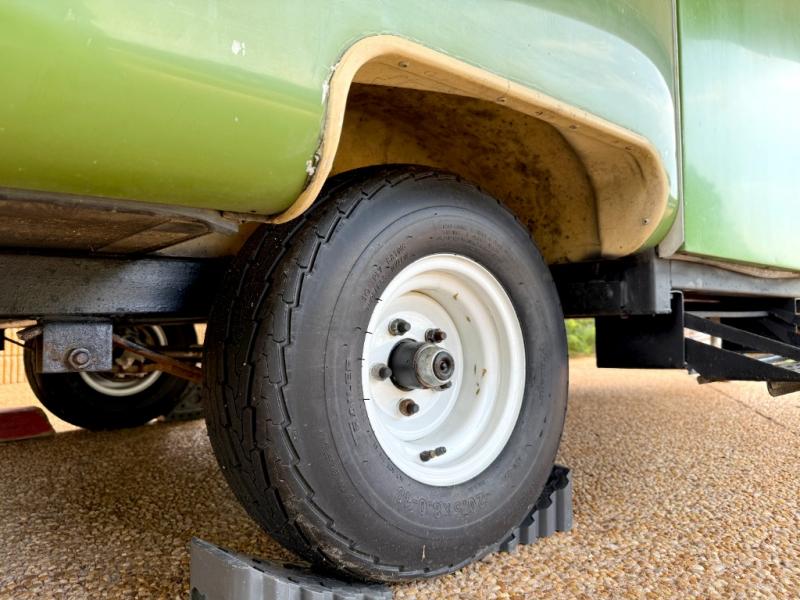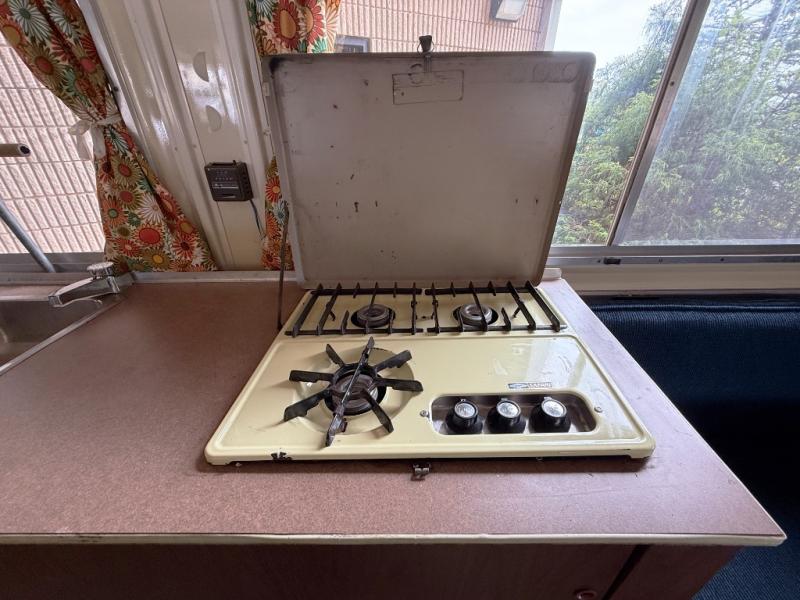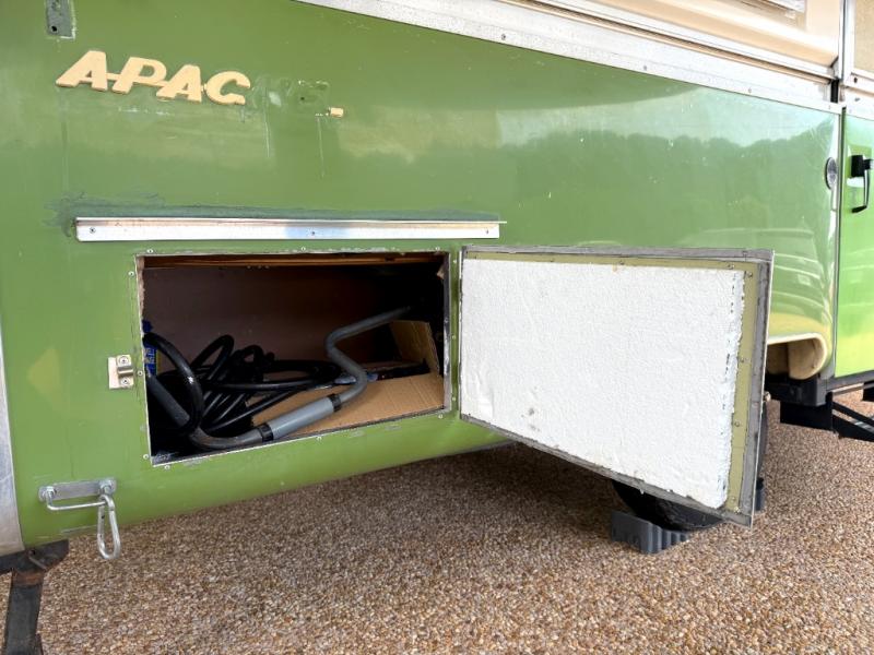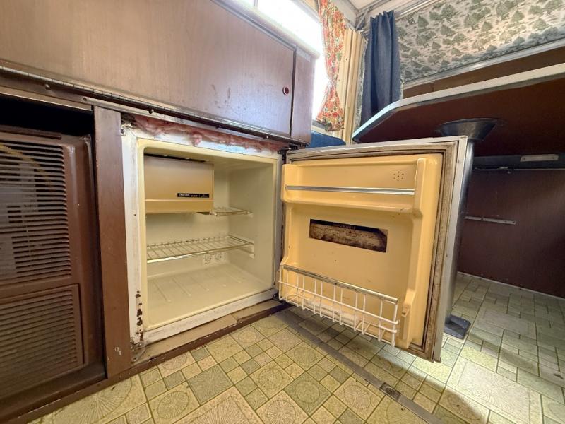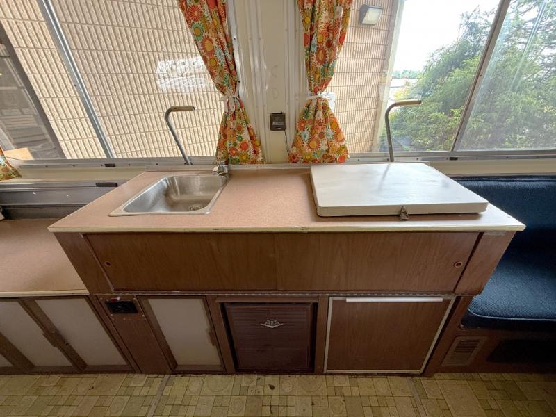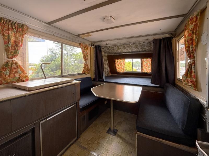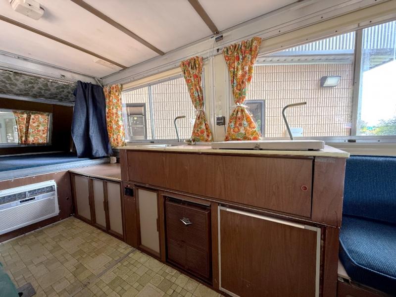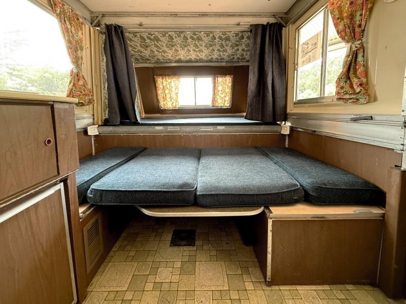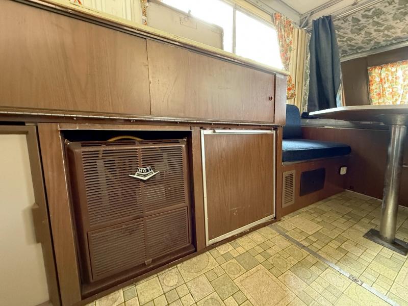 Inside, the 1975 Apache Ramada features a cozy and functional layout, with sleeping areas that can accommodate up to six people. The camper includes built-in furniture, such as a dinette that can convert into additional sleeping space, and comfortable beds with built-in storage underneath. The kitchen area is equipped with basic amenities like a stove, sink, and a small refrigerator, allowing for convenient meal preparation while on the road.