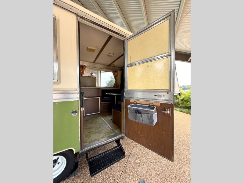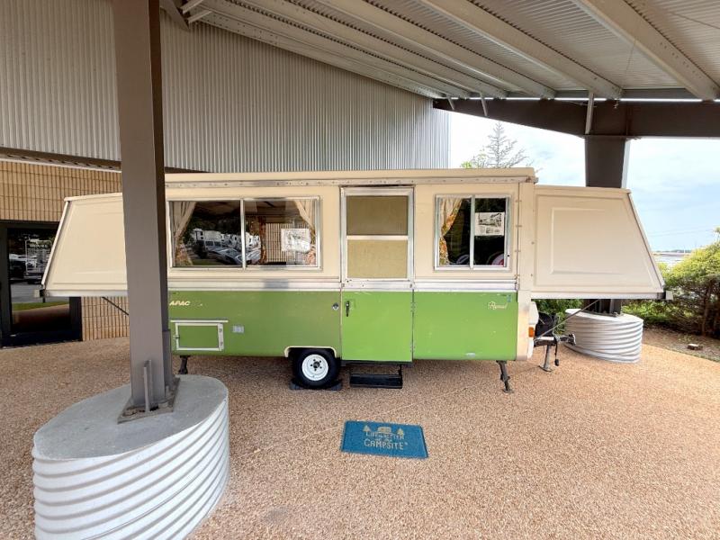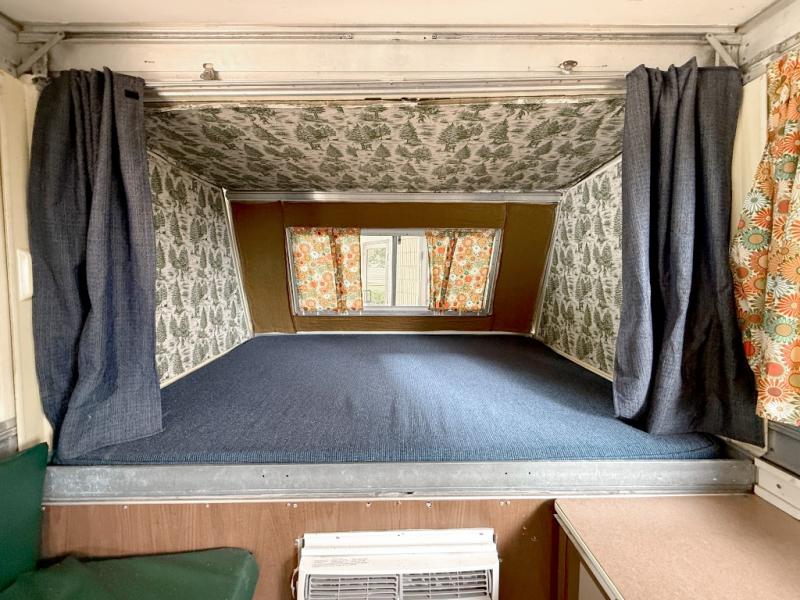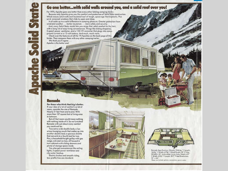 The 1975 Apache Ramada is a classic, fold-down camper that offers a unique and nostalgic camping experience with a vintage charm. Known for its durability and innovative design, this pop-up camper features a hard-shell roof, making it more weather-resistant and secure than typical canvas models. The Ramada is compact and lightweight, making it easy to tow, while still providing plenty of space and comfort once set up.