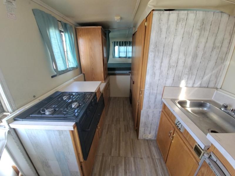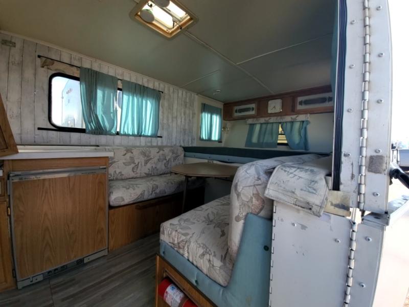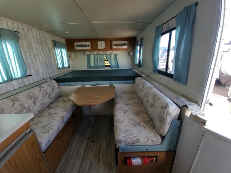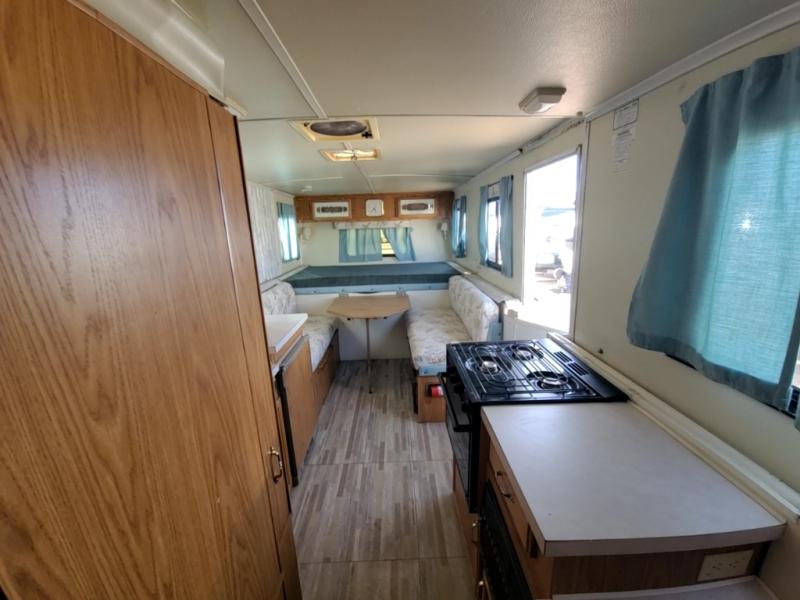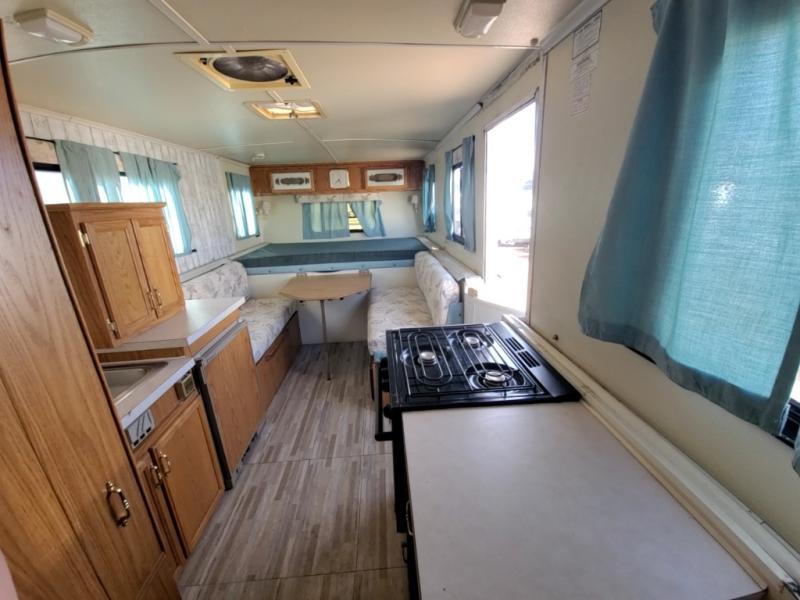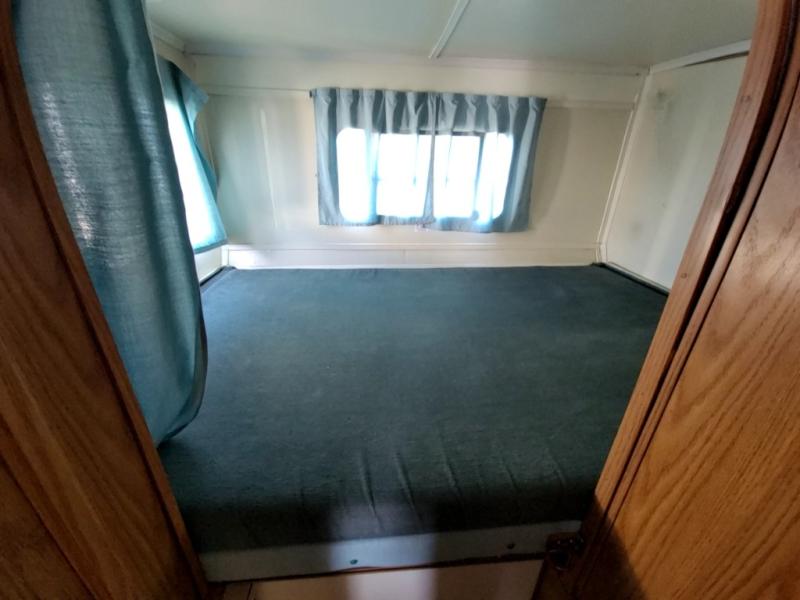 1998 Trail Manor camping trailer 25 foot long when fully opened when closed 16 feet long model number 2619 empty weight 2270 pounds sleeps six people comfortably one queen size front bed one queen size rear bed dinette table makes into a bed has furnace, air conditioning, gas, and electric refrigerator.