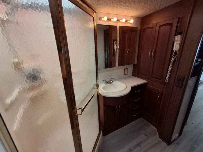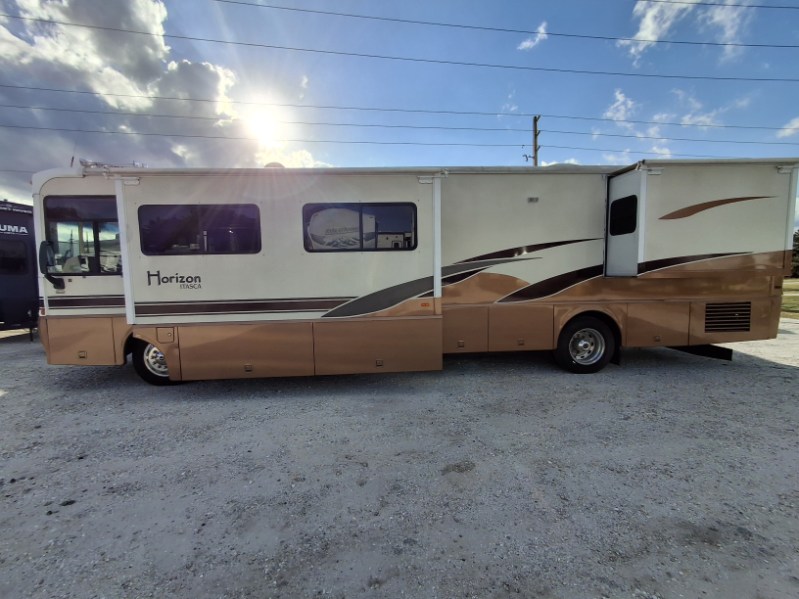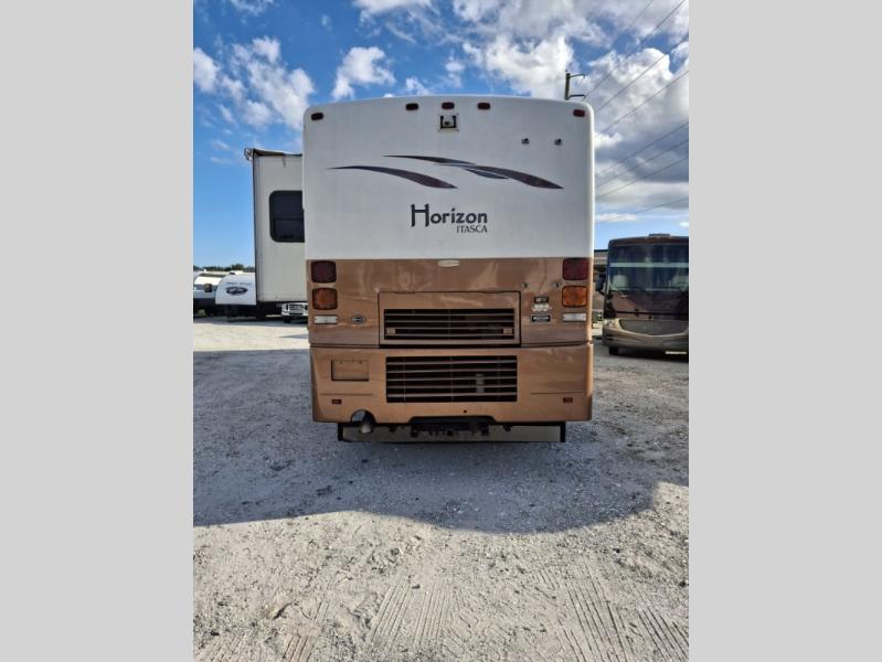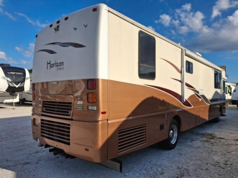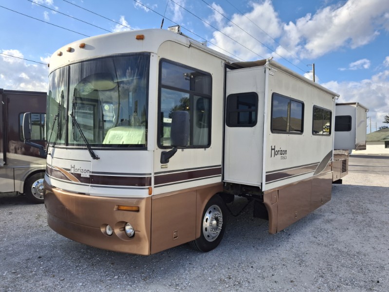 The 2002 Itasca Horizon is a Class A diesel pusher motorhome known for comfort and user-friendly features, built on a Freightliner chassis. Key features include standard dual slide-out rooms, a residential-style central air conditioner, Onan generator, and various amenities like an automatic leveling system, full kitchen, and ample storage. Depending on the specific model and options, engine horsepower varies, with common options including a 330HP Caterpillar or a 300HP Cummins.