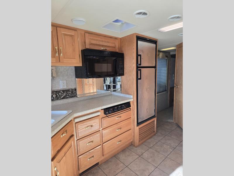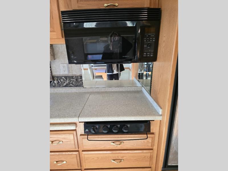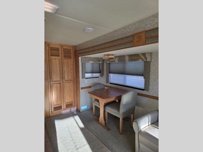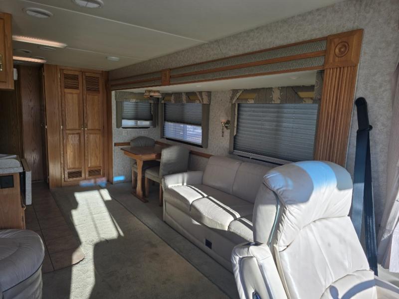 The exterior offers tons of pass-through basement storage, a rear folding metal carrier rack, exterior shower, rear black & white backup camera, double entry power step, drivers-side power window, electric and manual awnings, and a 12,000-lb 3-point trailer hitch with tow brake, making it ideal for towing and travel gear.