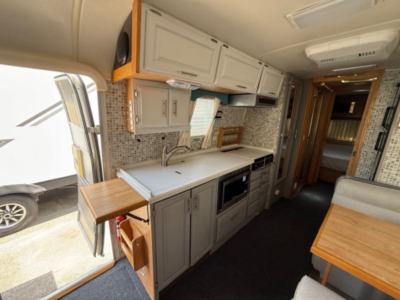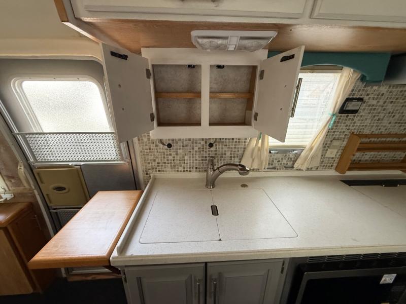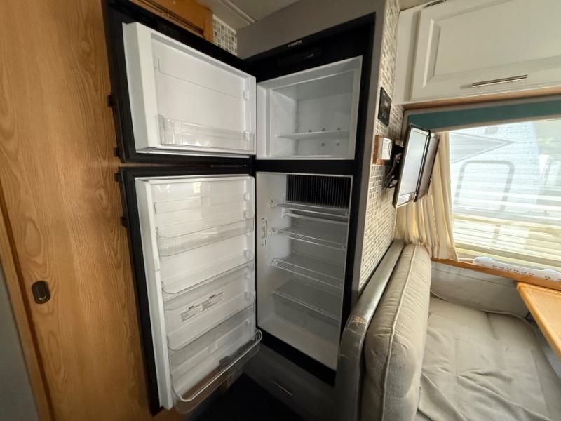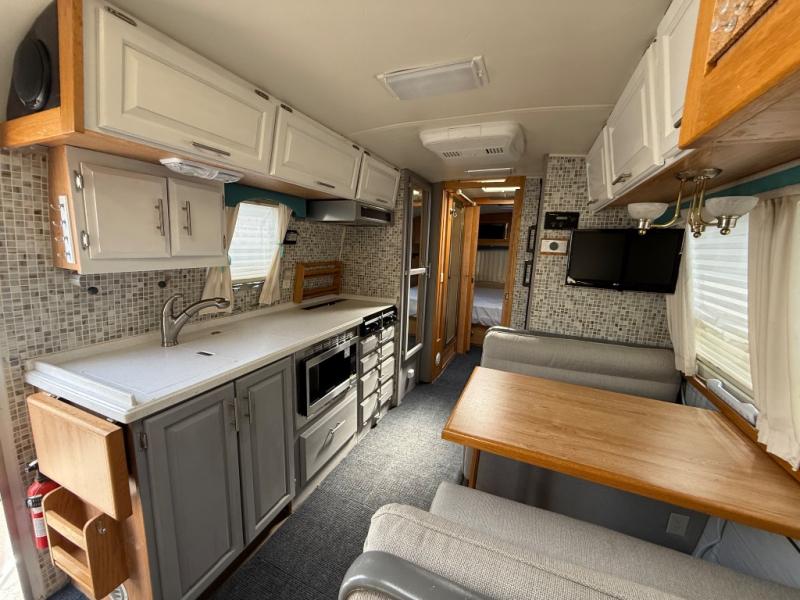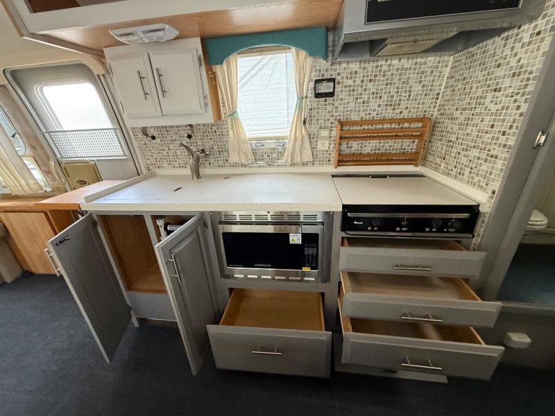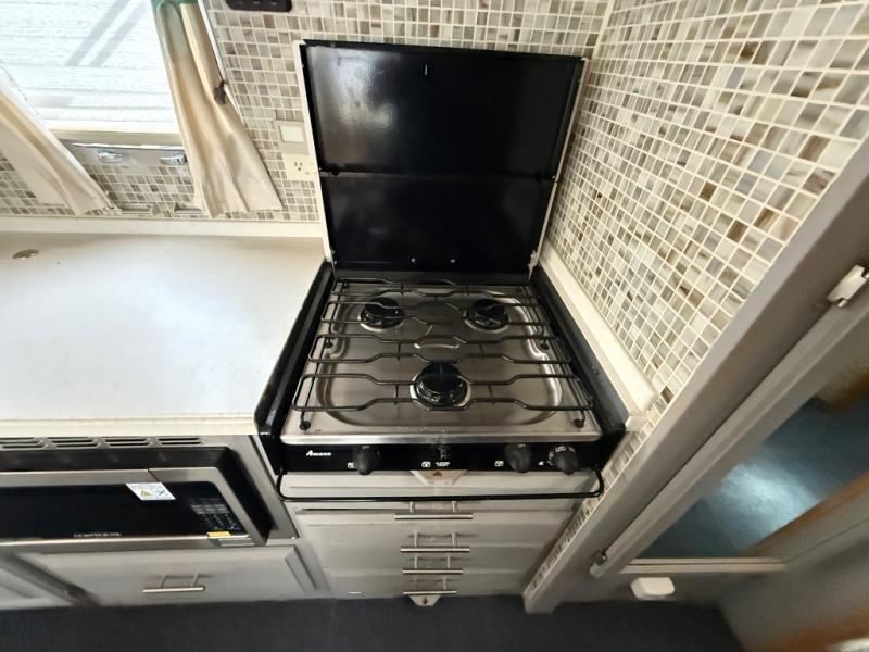 Appliances: 3-burner cooktop with oven, refrigerator, microwave-ready space, and a roof-mounted air conditioner
