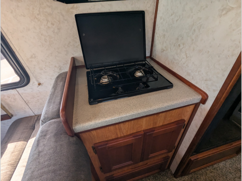 Gourmet Kitchen: Fully equipped with a 3-way refrigerator/freezer, 2-burner gas cooktop, microwave, and high-quality solid surface countertops.