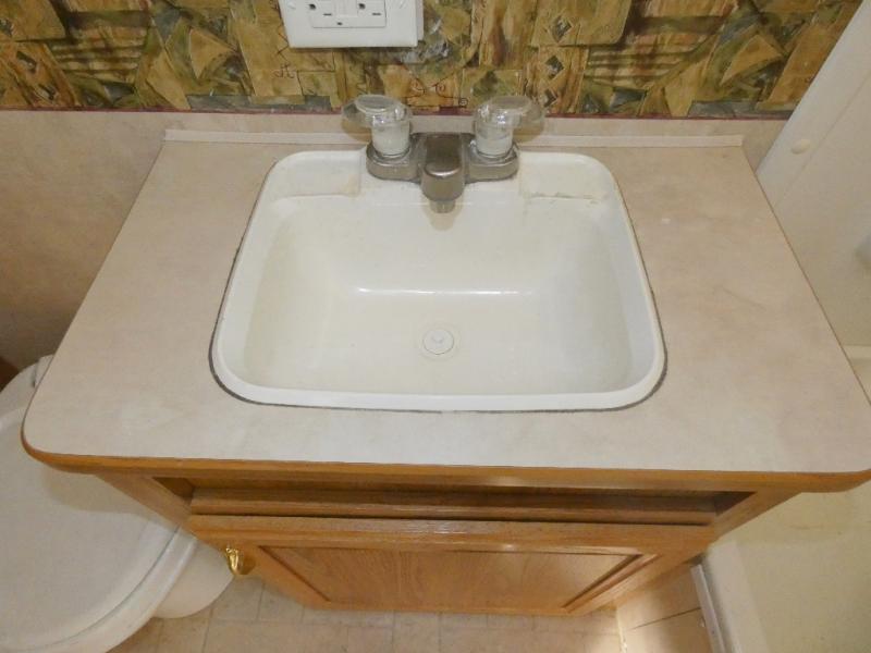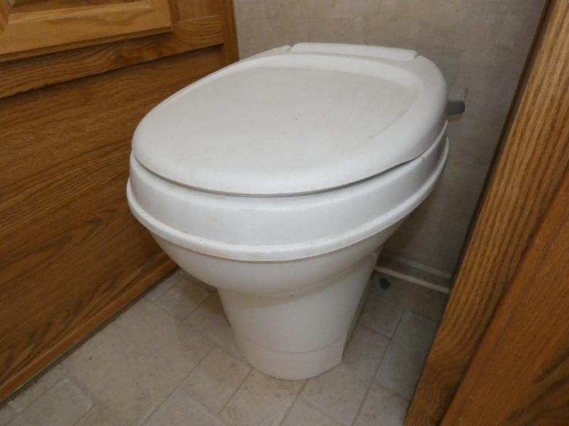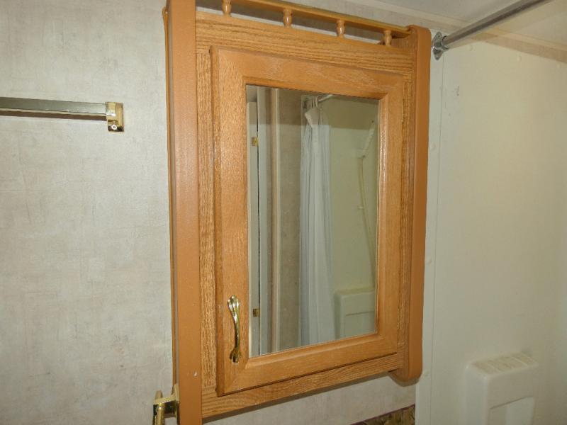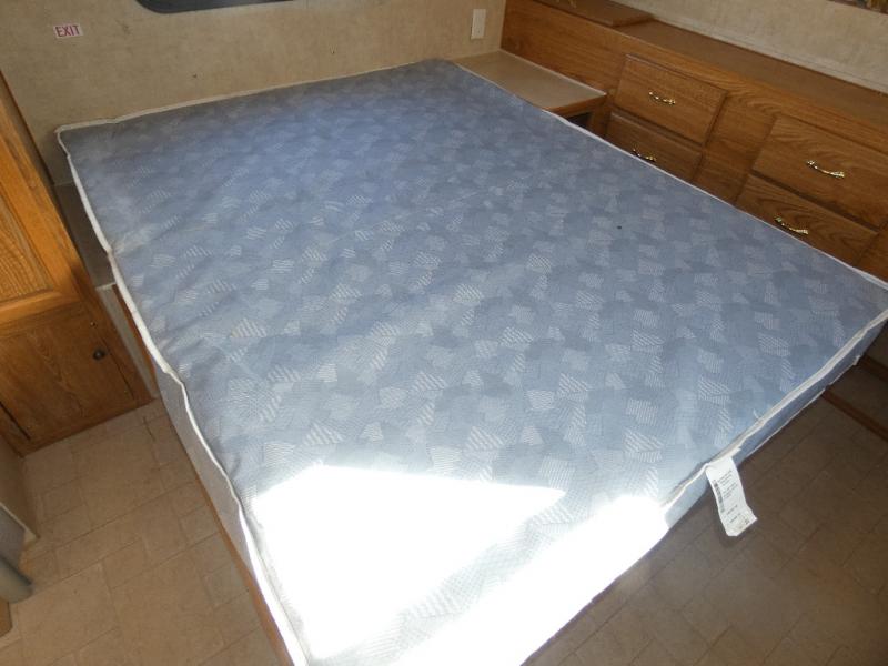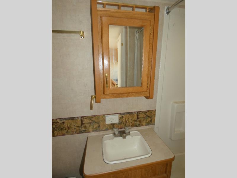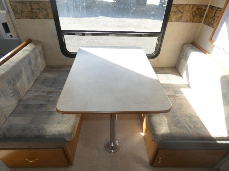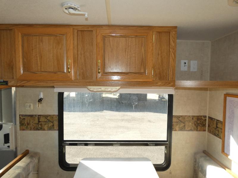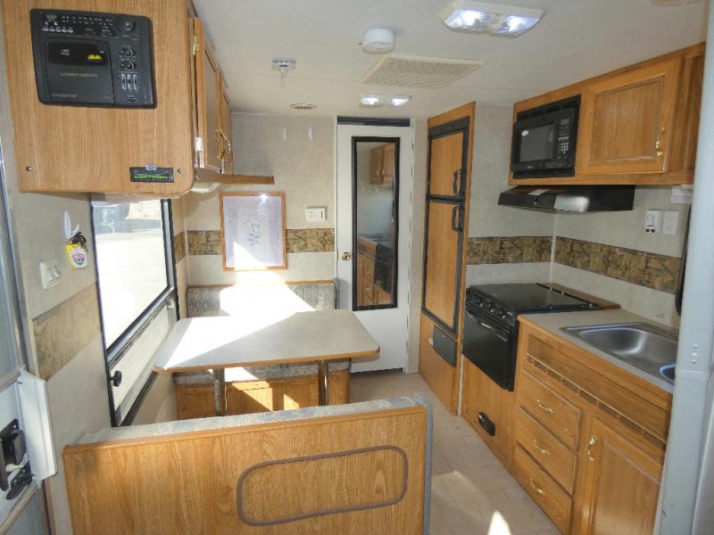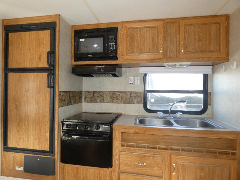 This RV has a warm, compact layout that makes smart use of its space. As you step inside, you’re greeted by a cozy dinette to the left with cushioned bench seating around a table, perfect for meals or relaxing, and it can likely convert into an extra sleeping spot if needed. Across from the dinette is the kitchen, which is fully equipped with a double sink, stovetop, oven, and a microwave set into the cabinetry above. There’s plenty of storage built in, with oak-finished cabinets and drawers lining the space. Just beyond the kitchen sits a full refrigerator and freezer, tucked neatly into the wall.
