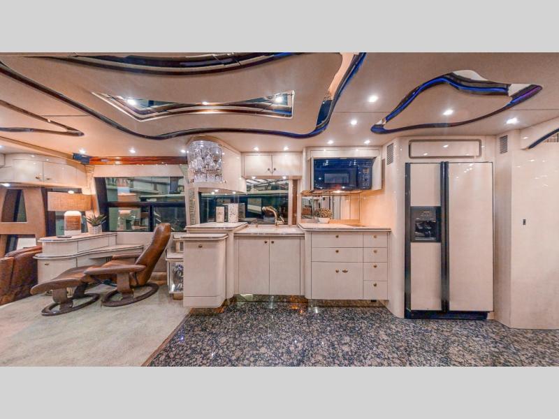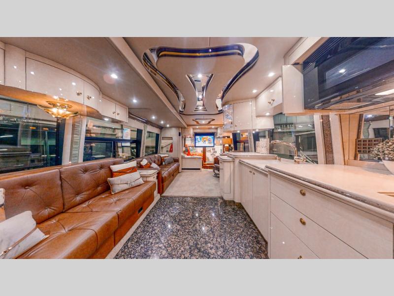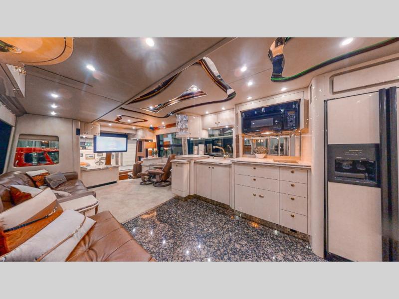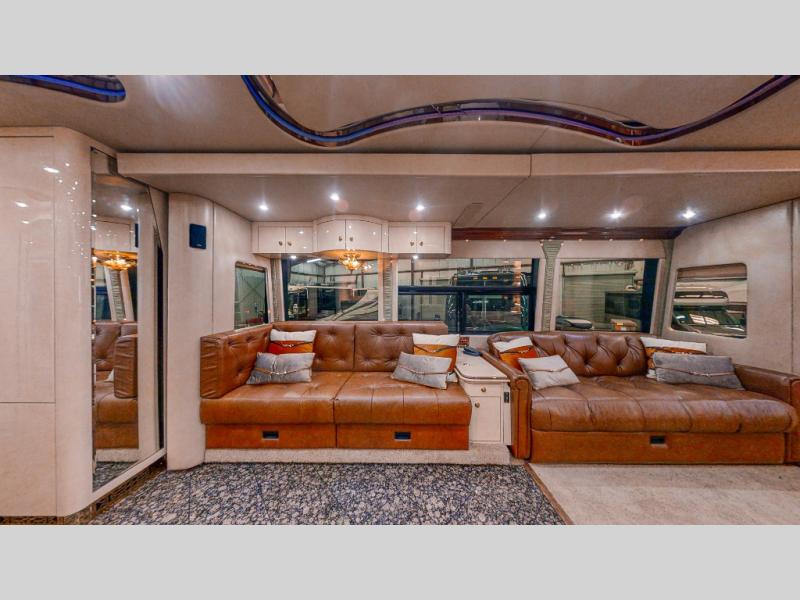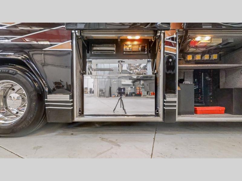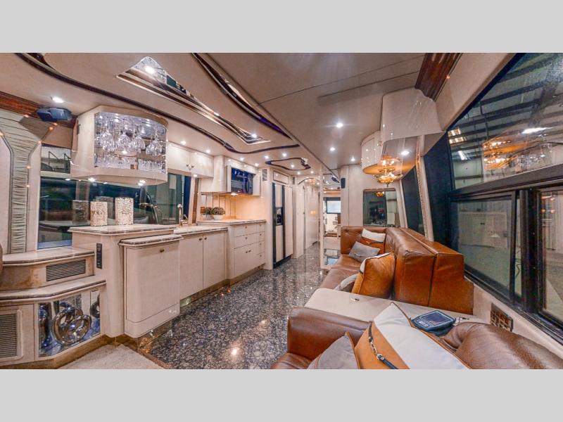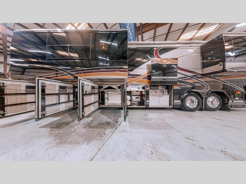 Engine / Trans Service less than 4k miles, PowerTech 20kw generator 2024 service w/new fan motors, Full Pass-thru bay w/ double slide trays, Outdoor slide-out kitchen bay, Outdoor Freezer and TV bay, 4 Zipdee powered awnings, Blue undercarriage accent lighting, Stacked washer and dryer, Kitchenaid Side bu Side Refrigerator, New GE Microwave/ Convection Oven, 2 burner cooktop, Large galley w/pull-out island and pantry, Dinette with 2 chairs, Fiber Optic accent lighting in ceiling, Huge hallway vanity, Private toilet room with vanity, Large Corian shower with glass enclosure, Queen Bed, Salon and bedroom TV’s on lift, Powered Jack knife leather sofa, Hardwood and marble floors throughout , Dinette Table With 2 Chairs, Large Galley With Pull Out Pantry