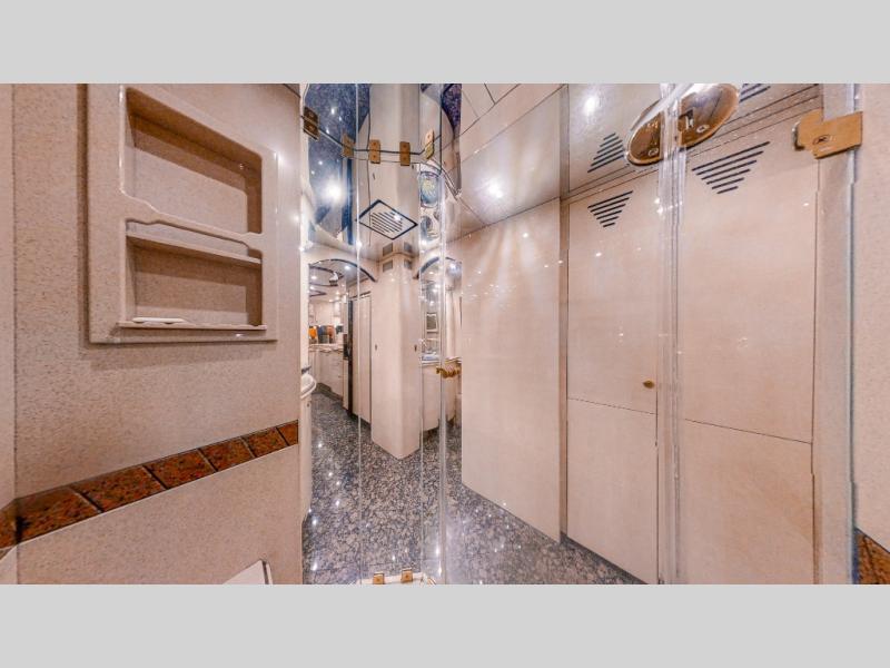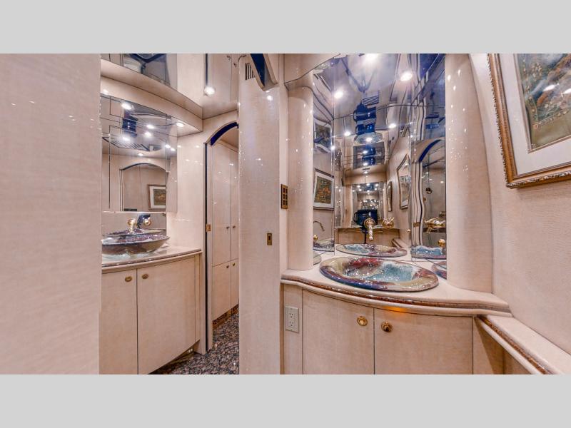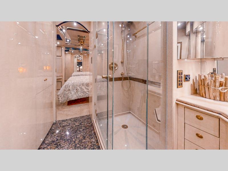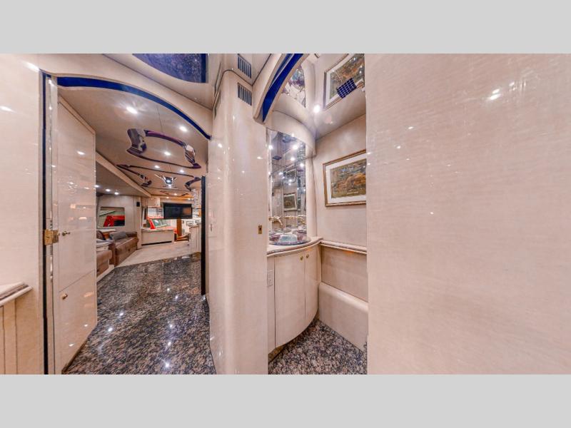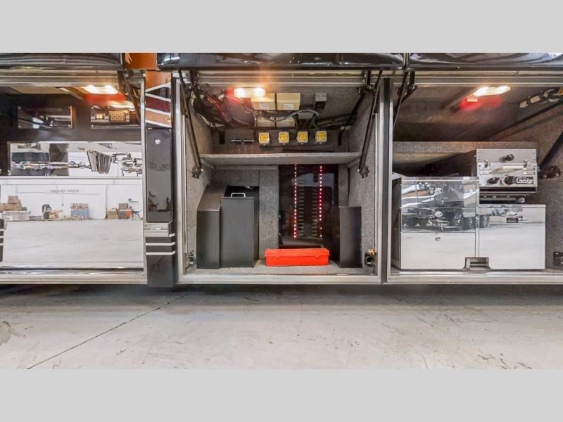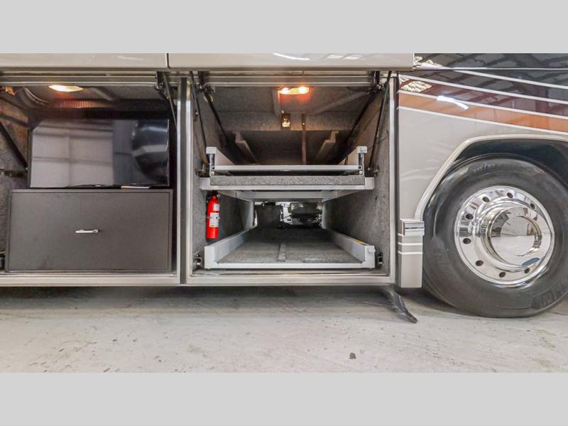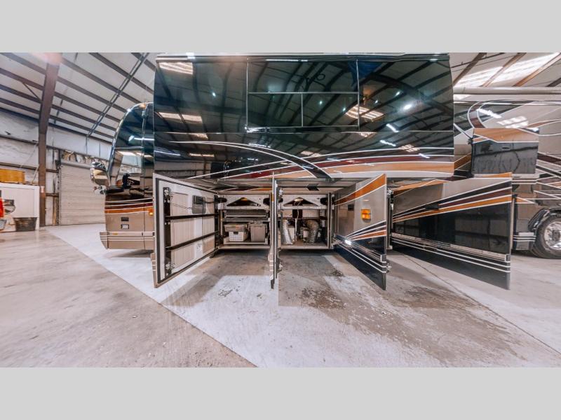 Engine / Trans Service less than 4k miles, PowerTech 20kw generator 2024 service w/new fan motors, Full Pass-thru bay w/ double slide trays, Outdoor slide-out kitchen bay, Outdoor Freezer and TV bay, 4 Zipdee powered awnings, Blue undercarriage accent lighting, Stacked washer and dryer, Kitchenaid Side bu Side Refrigerator, New GE Microwave/ Convection Oven, 2 burner cooktop, Large galley w/pull-out island and pantry, Dinette with 2 chairs, Fiber Optic accent lighting in ceiling, Huge hallway vanity, Private toilet room with vanity, Large Corian shower with glass enclosure, Queen Bed, Salon and bedroom TV’s on lift, Powered Jack knife leather sofa, Hardwood and marble floors throughout , Dinette Table With 2 Chairs, Large Galley With Pull Out Pantry