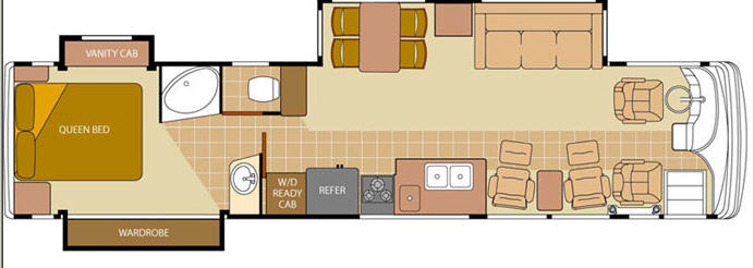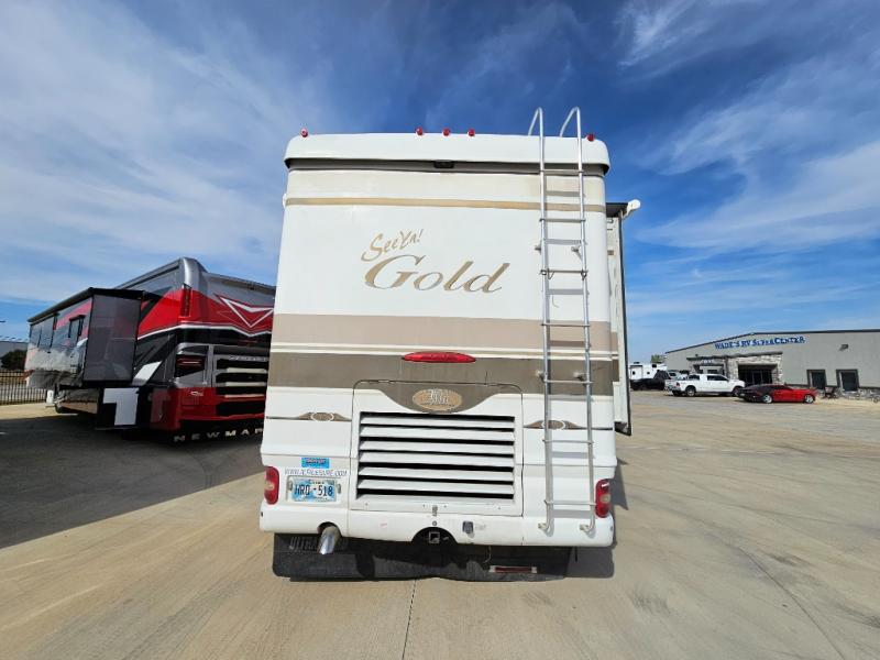 Inside, the See Ya Gold is designed to offer a luxurious and comfortable living experience. The spacious interior features high-quality materials and finishes, including plush carpeting, solid surface countertops, and hardwood cabinetry. The living area is equipped with a comfortable sofa and a recliner, providing a perfect space for relaxation. The motorhome also includes a 32" LCD TV and a home theater system for entertainment.