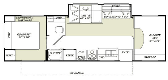 Single Slide, Rear Queen Bed w/Nightstand & Shirt Wardrobe, Shower, Separate Stool Room w/Lav., Booth Dinette & Sofa Bed Slideout, Refrigerator, Spice Rack, 3 Burner Range, Microwave, Double Kitchen Sink, Cabover Bed, Storage Above Cab & More.