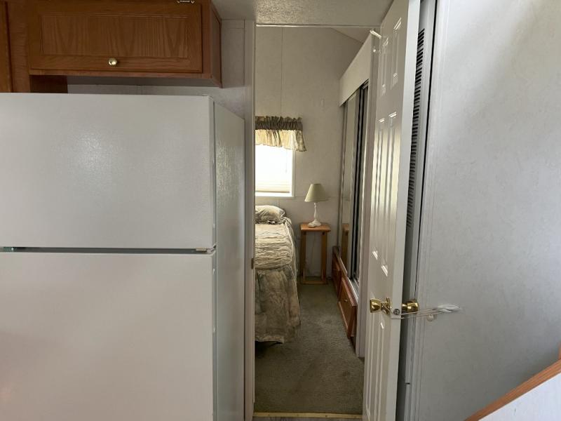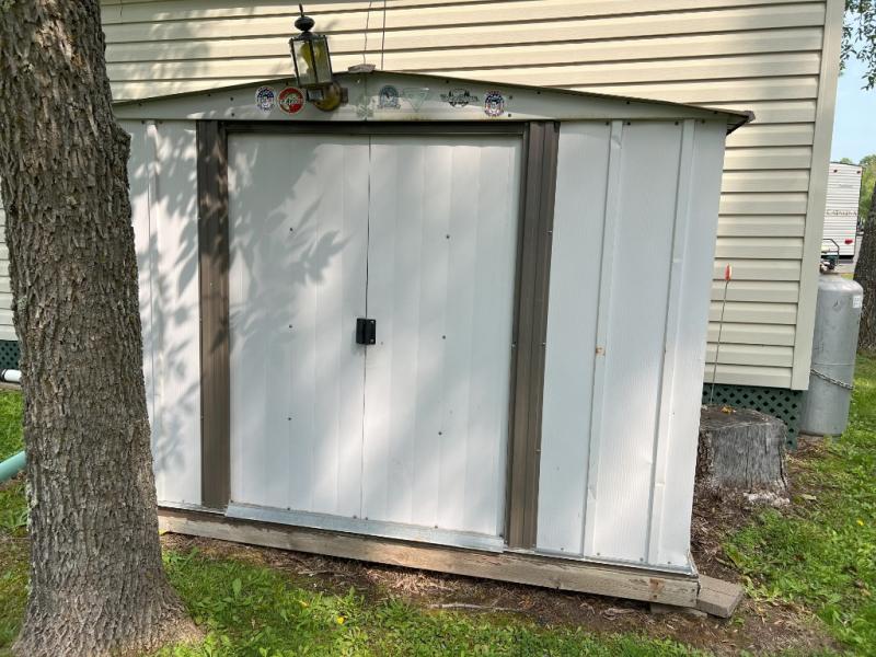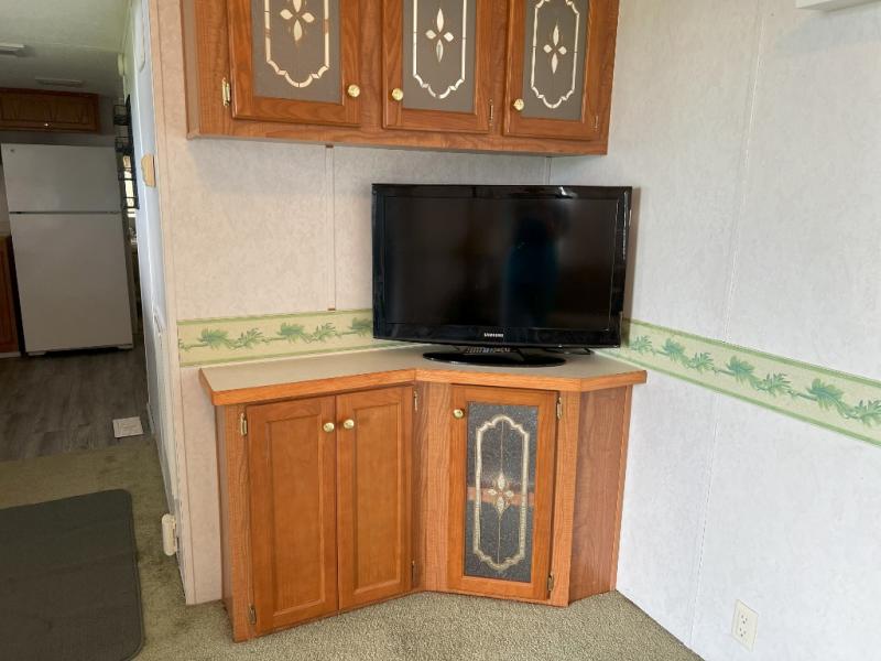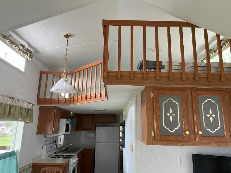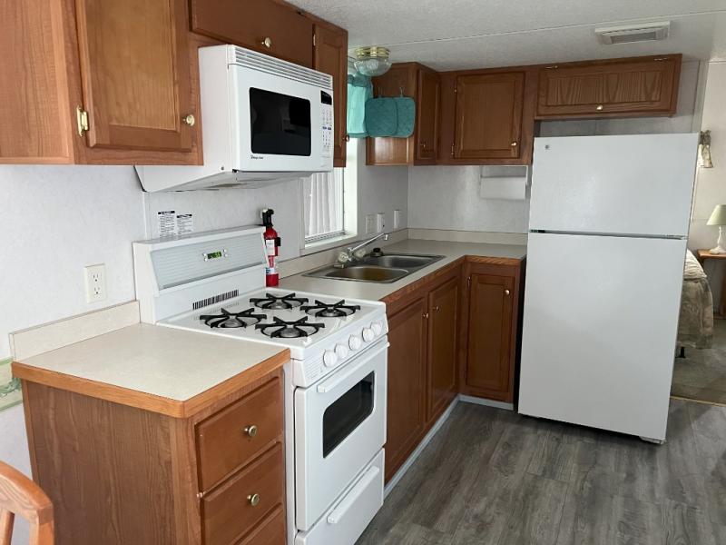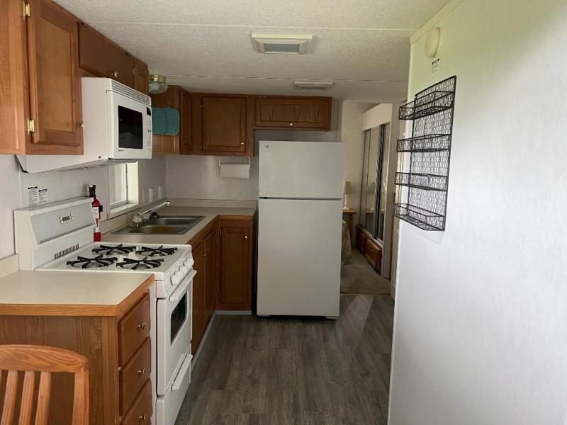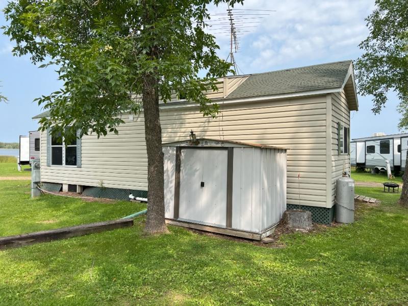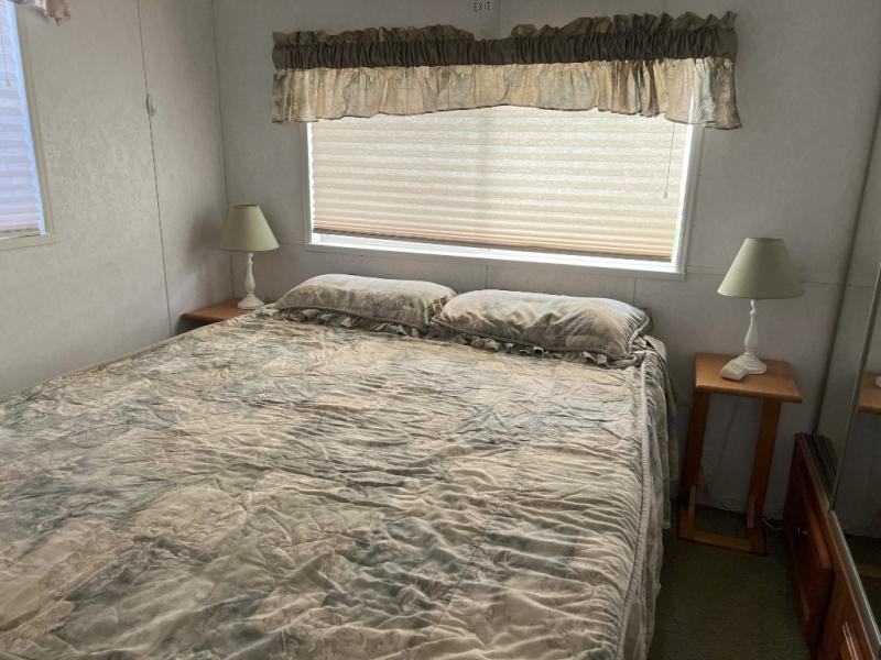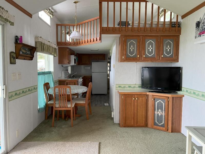 This park model is a cozy park model. As you walk through the patio door you enter the front living room. The front living room has a sofa sleeper and glider rocker with foot stool that faces the entertainment center/hutch. As you go towards the rear of the park model, there is a table with 4 chairs and the kitchen on the left. The kitchen has a microwave, residential size refrigerator and range. Around the corner on the right side is the residential bath. In the rear of the park model is a queen size bed with closet, chest of drawers and TV shelf. Above the kitchen and bath room is a loft that has plenty of room for the kids or grandkids! This park model has ducted AC and a ducted furnace. There is also two ceiling fans. There is a deck and hard awning to sit out on and under while you enjoy the "lake life". Screen has been added for more privacy. There is a metal shed and plastic shed/bin included for all your storage needs.