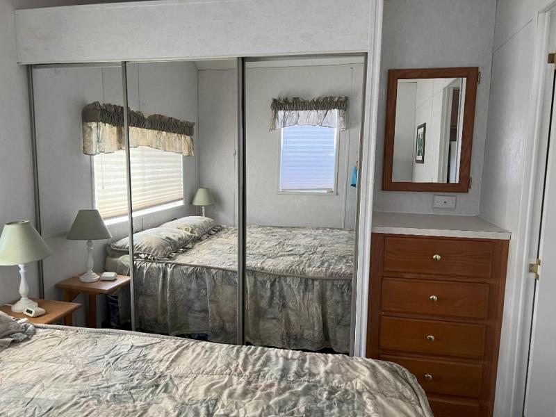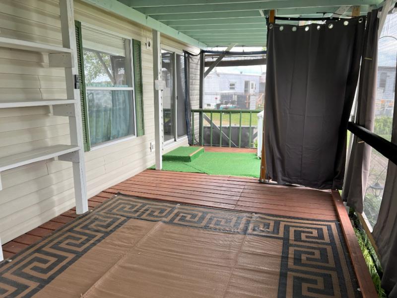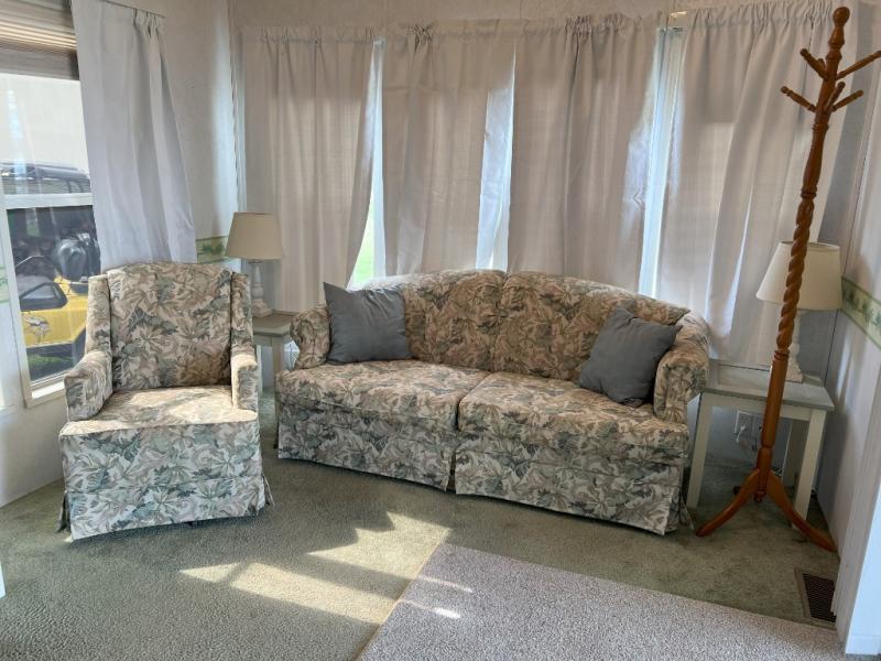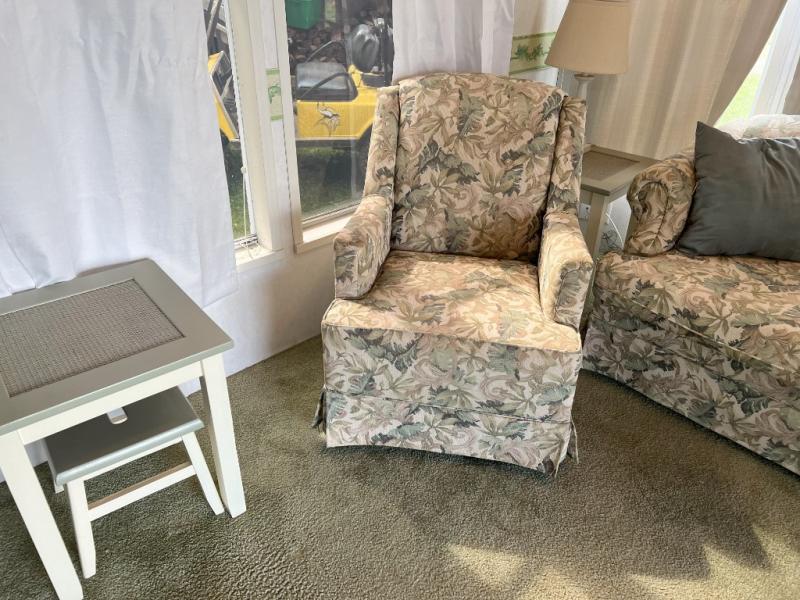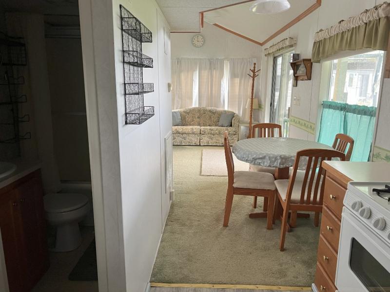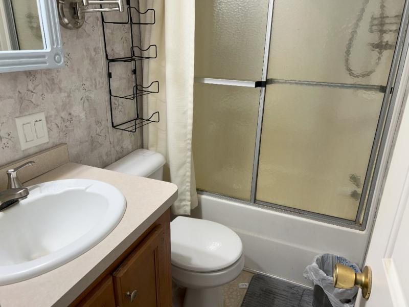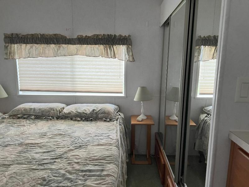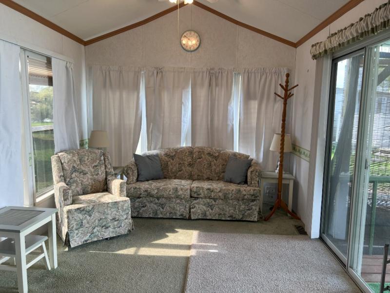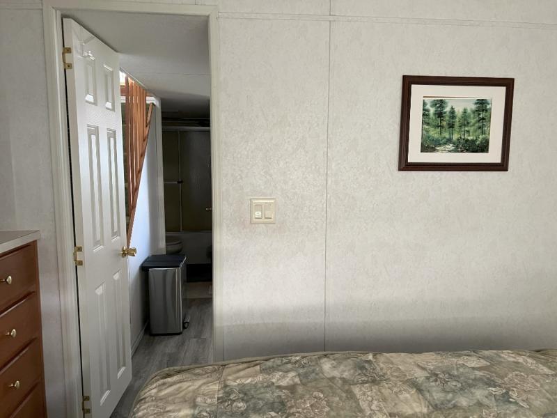 This park model is a cozy park model. As you walk through the patio door you enter the front living room. The front living room has a sofa sleeper and glider rocker with foot stool that faces the entertainment center/hutch. As you go towards the rear of the park model, there is a table with 4 chairs and the kitchen on the left. The kitchen has a microwave, residential size refrigerator and range. Around the corner on the right side is the residential bath. In the rear of the park model is a queen size bed with closet, chest of drawers and TV shelf. Above the kitchen and bath room is a loft that has plenty of room for the kids or grandkids! This park model has ducted AC and a ducted furnace. There is also two ceiling fans. There is a deck and hard awning to sit out on and under while you enjoy the "lake life". Screen has been added for more privacy. There is a metal shed and plastic shed/bin included for all your storage needs.