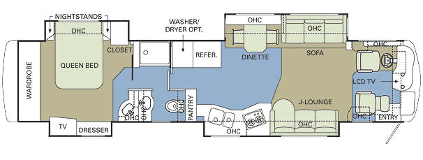 Quad Slide, Rear Wardrobe, Queen Bed Slideout w/Nightstands & Closet, Dresser, TV, Lav., Stool Room w/Lav., Shower, Wash/Dryer Opt. Refrigerator, Pantry, Double Kitchen Sink, 2 Burner Range, Dinette w/Chairs, J-Lounge, Sofa, LCD TV, Overhead Cabinets & Much More.