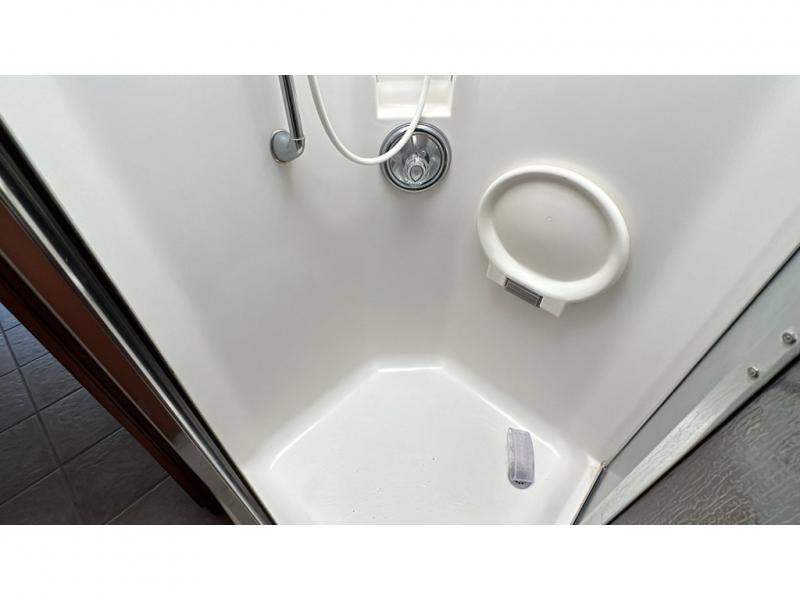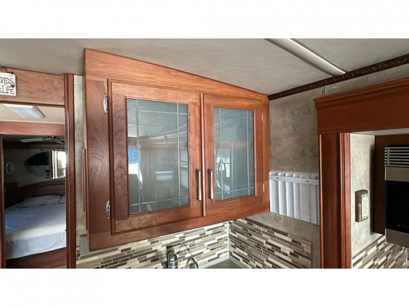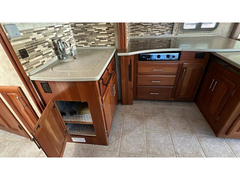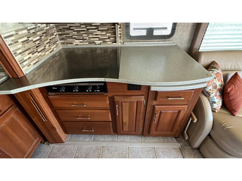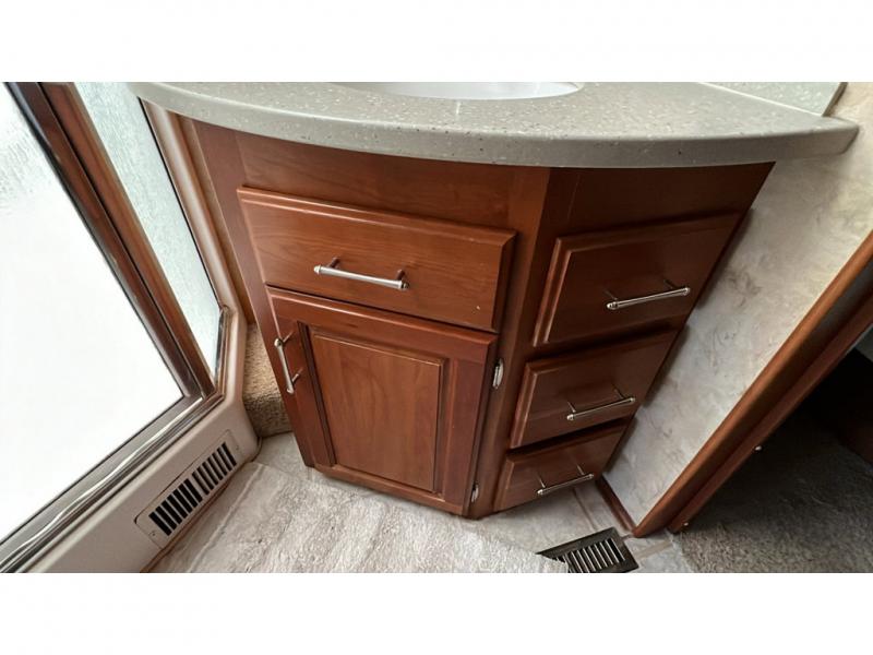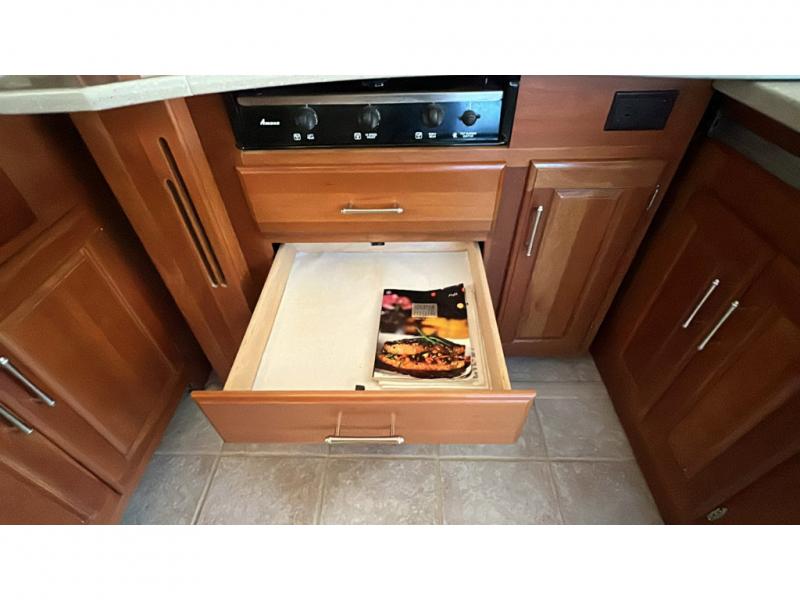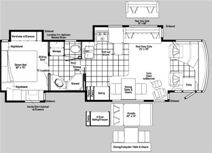 Quad Slide, Rear Queen Bed w/Wardrobe & Vanity/Shirt Cabinet w/Drawers Slides, LCD TV, Angle Shower, Opt. Washer/Dryer, Pantry, Refrigerator, Double Kitchen Sink, 3 Burner Range, Pull-Out Kitchen Island, Rest Easy Sofa, Dining Table & Chairs, Euro Chair /w/Ottoman, and More