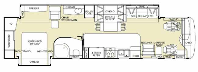 Double Slide w/One Full Side Slideout, Rear Queen Bed w/Nightstands, Wardrobe, TV, Dresser, Chair w/Ottoman, Angle Shower, Vanity w/Overhead Cabinet, Utility Cabinet, Pantry, 4-Door Refrigerator, 3 Burner Range w/Micro Above, Sink, Booth Dinette w/Table Ext. & Chairs, Recliner, Sofa Bed, and More.