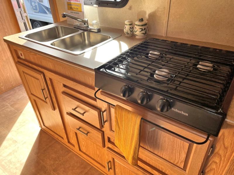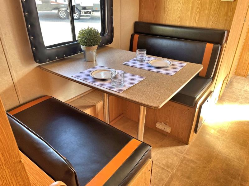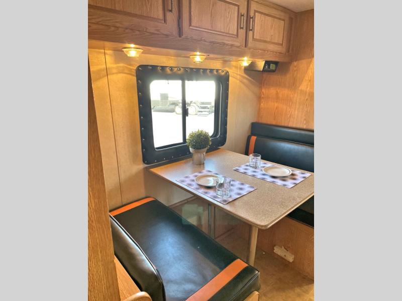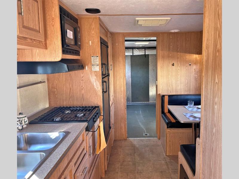 Front Double Bed w/Wardrobe, Shirt Closet w/TV Shelf, Nightstand, Shower, Vanity w/Mirror, Double Kitchen Sink, Booth Dinette, Refrigerator, 3 Burner Range, 9 Ft. 6 In. Cargo Toy Parking Space & More.
