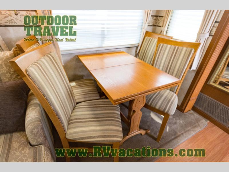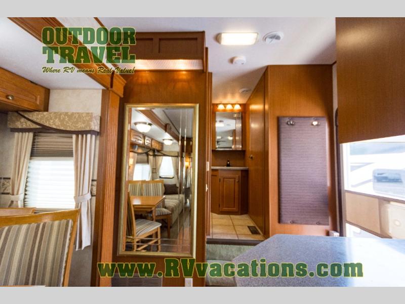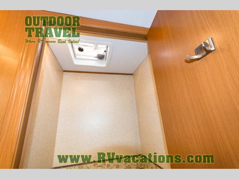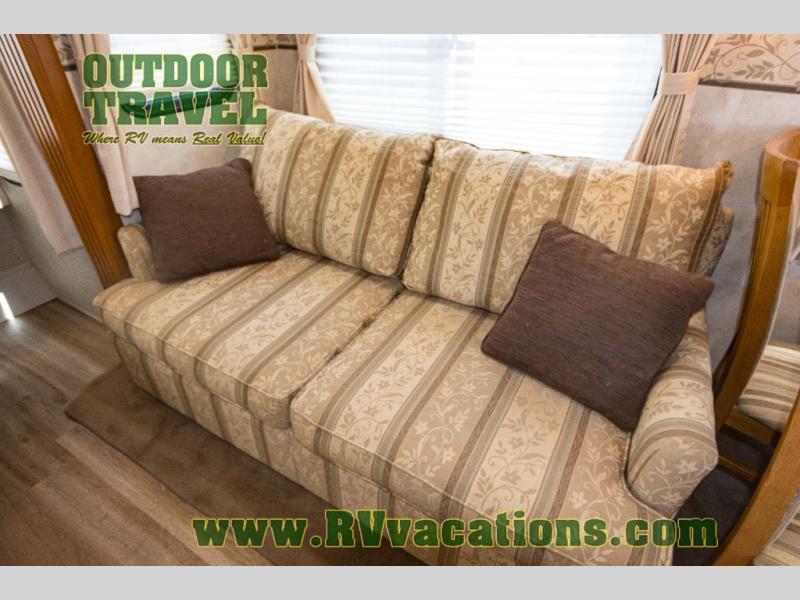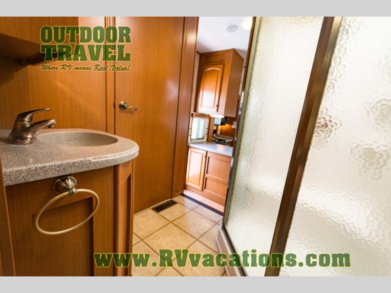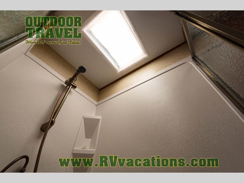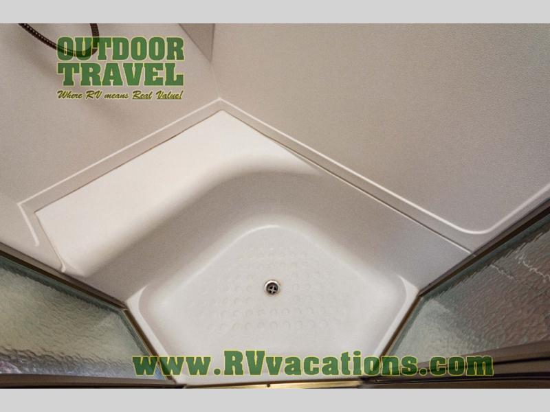 The interior is equipped with a DVD/CD 5.1 surround sound entertainment system, Corian-look countertops, a porcelain toilet, day-night shades, and a skylight above the shower.