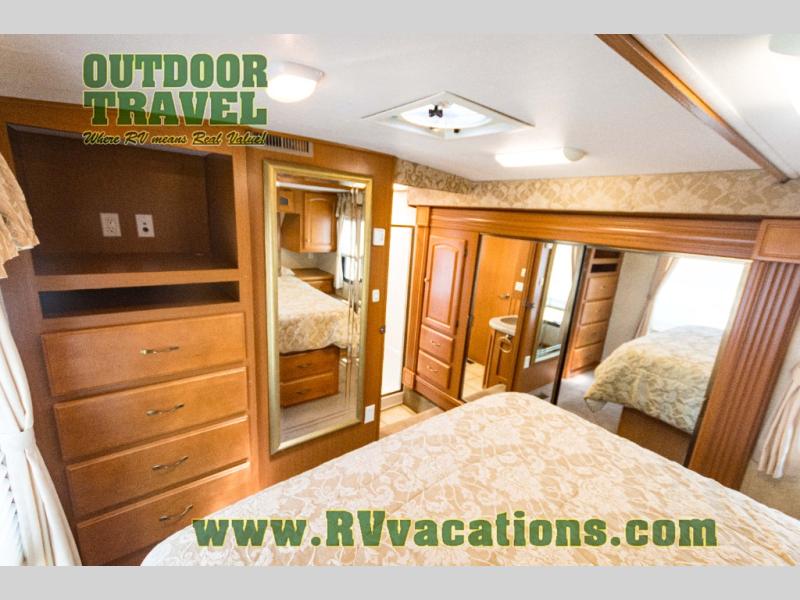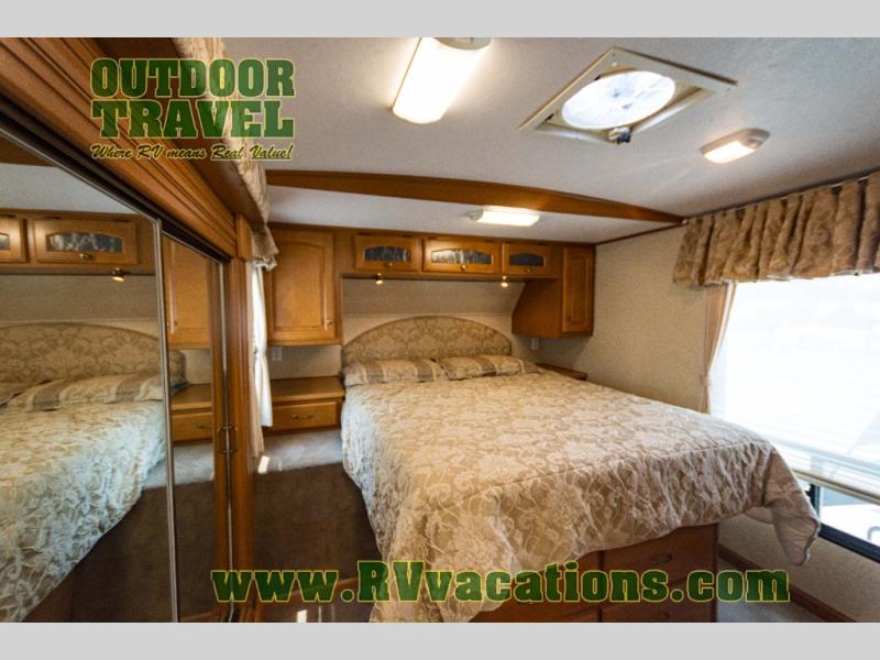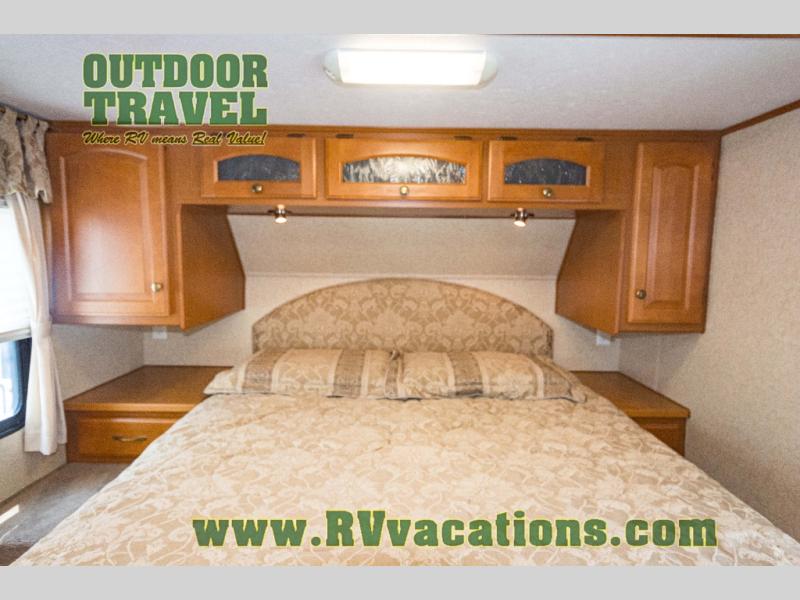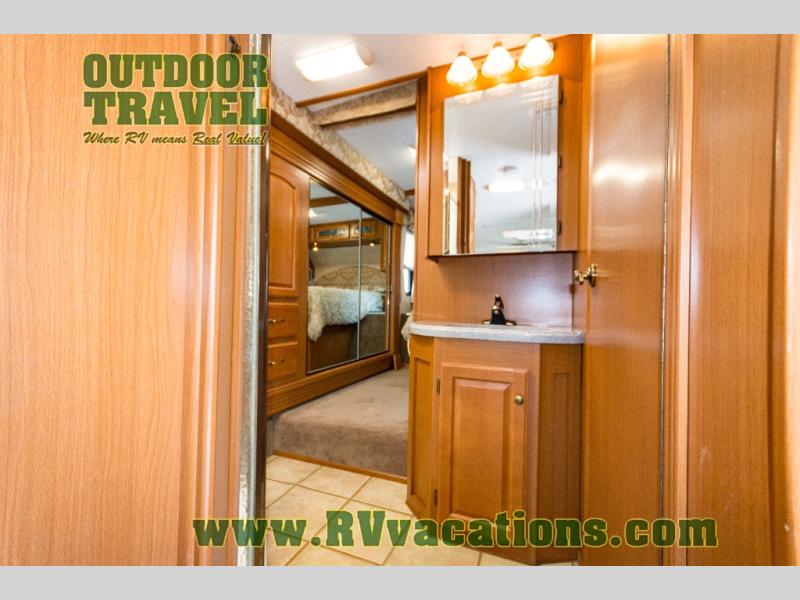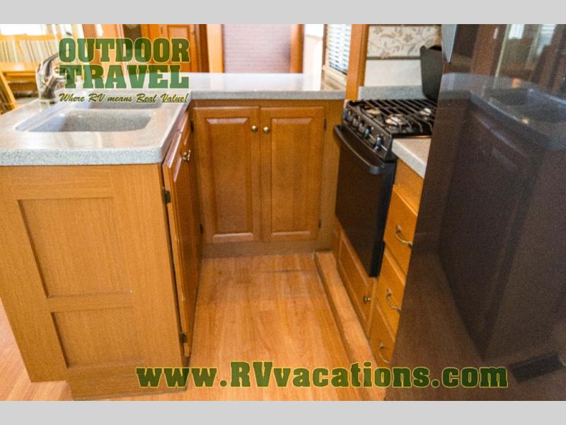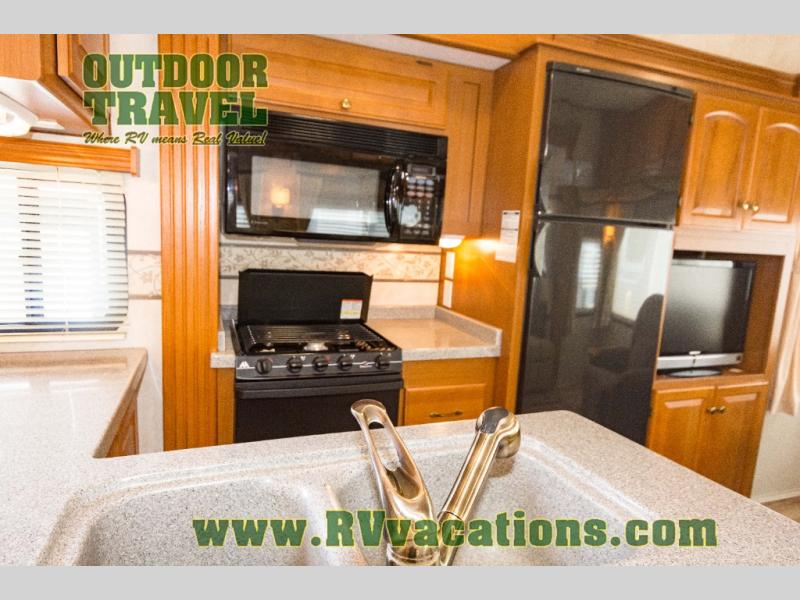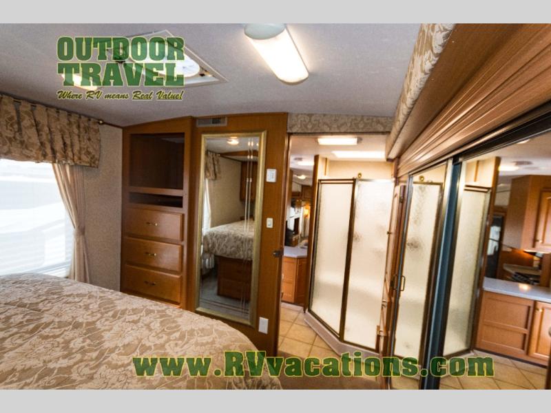 The interior is equipped with a DVD/CD 5.1 surround sound entertainment system, Corian-look countertops, a porcelain toilet, day-night shades, and a skylight above the shower.