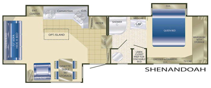 Triple Slide, Rear Living Area w/Hide-A-Bed Sofa, Lounge Chair & End Table, Ent. Center, Dinette w/Chairs, Opt. Kitchen Island, Double Sink, 3 Burner Range, Pantry, Refrigerator, Overhead Cabinets, Angle Shower, Med. Cabinet, Linen Closet , Queen Bed, Dresser, TV Cab., Wash/Dryer Prep & Much More.
