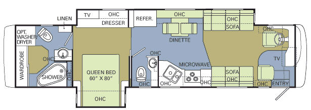 Double Slide, Rear Bath w/Wardrobe, Opt. Wash/Dryer, Linen Closet, Lav., Overhead Cabinets, Queen Bed Slideout, Super Full Wall Slide Drivers Side, TV/Dresser/Refrig./Dinette w/Chairs & Sofa Sleeper, TV Above Cab, 2nd Sofa, 3 Burner Range, Dbl. Kitchen Sink, Micro., Half Bath w/Stool & Lav. & More.