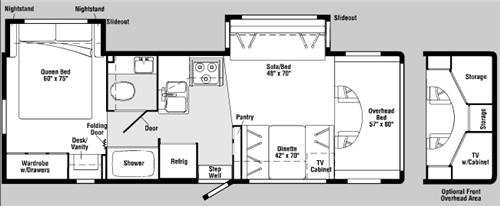 Double Slide, Queen Bed w/Nightstands, Wardrobe w/Drawers, Desk/Vanity, Folding Bedroom Door, Shower, Refrigerator, Double Kitchen Sink, 3 Burner Range, Booth Dinette w/Seat Belts, TV Cabinet, Sofa Bed Slideout w/Seat Belts, Over Cab Double Bed or Storage & TV Cabinet, and More.