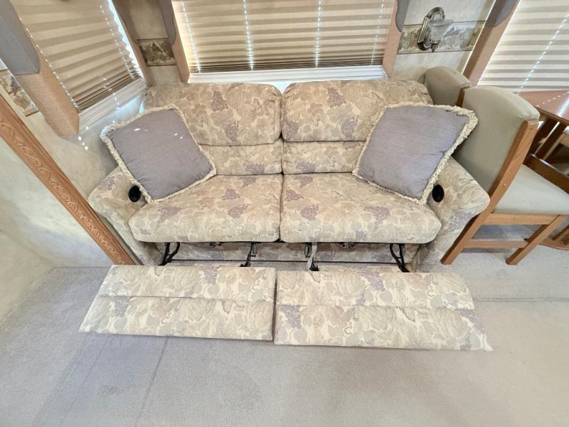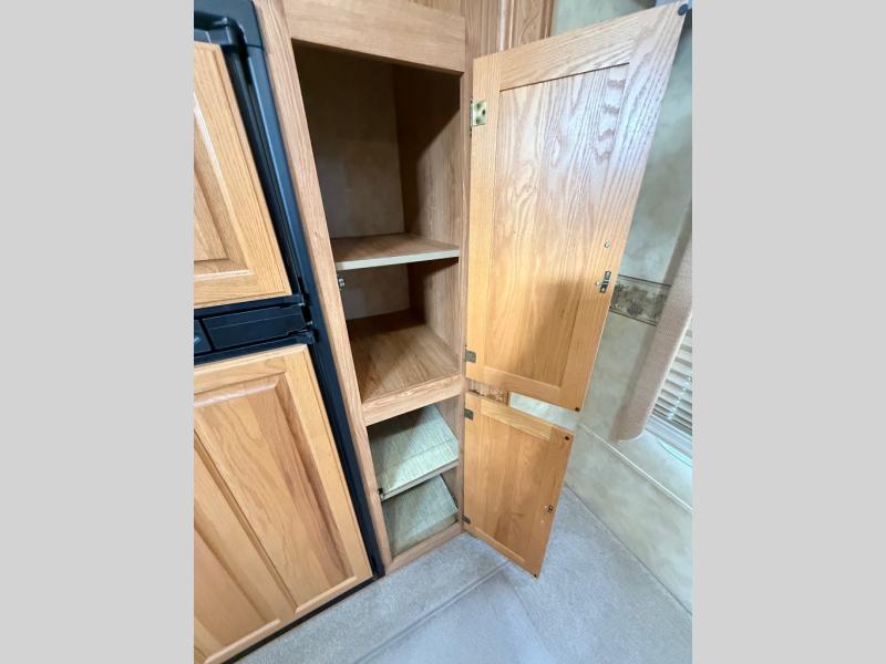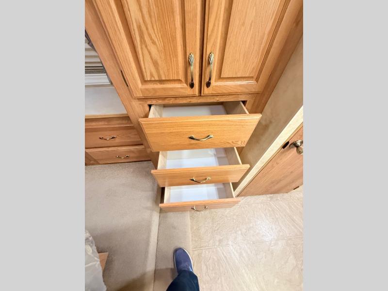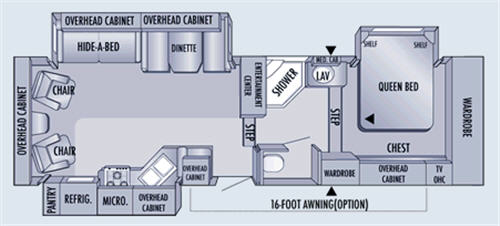 Triple Slide, Sofa, Dinette or Free Standing Table & Chairs, Double Kitchen Sink, Refrigerator, 3 Burner Range, Pantry, Ent.Center, Step Up to Bath, Angle Shower, Medicine Cabinet, Wardrobe, Step Up to Queen Bed Slide, Chest of Drawers, TV Cabinet Above, Full Wall Wardrobe, and More